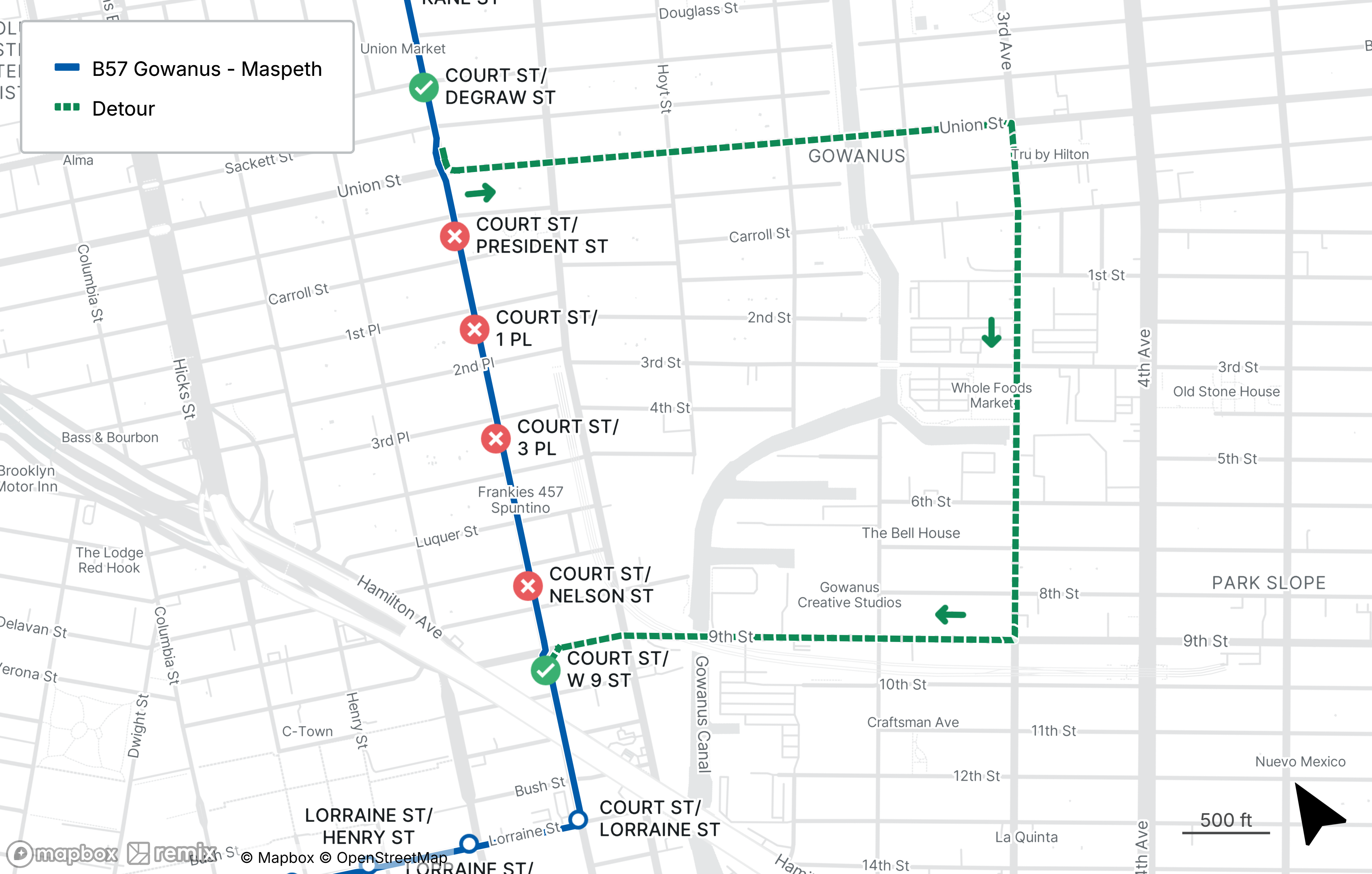 Southbound B57 stops on Court St from President St to Nelson St will be closed