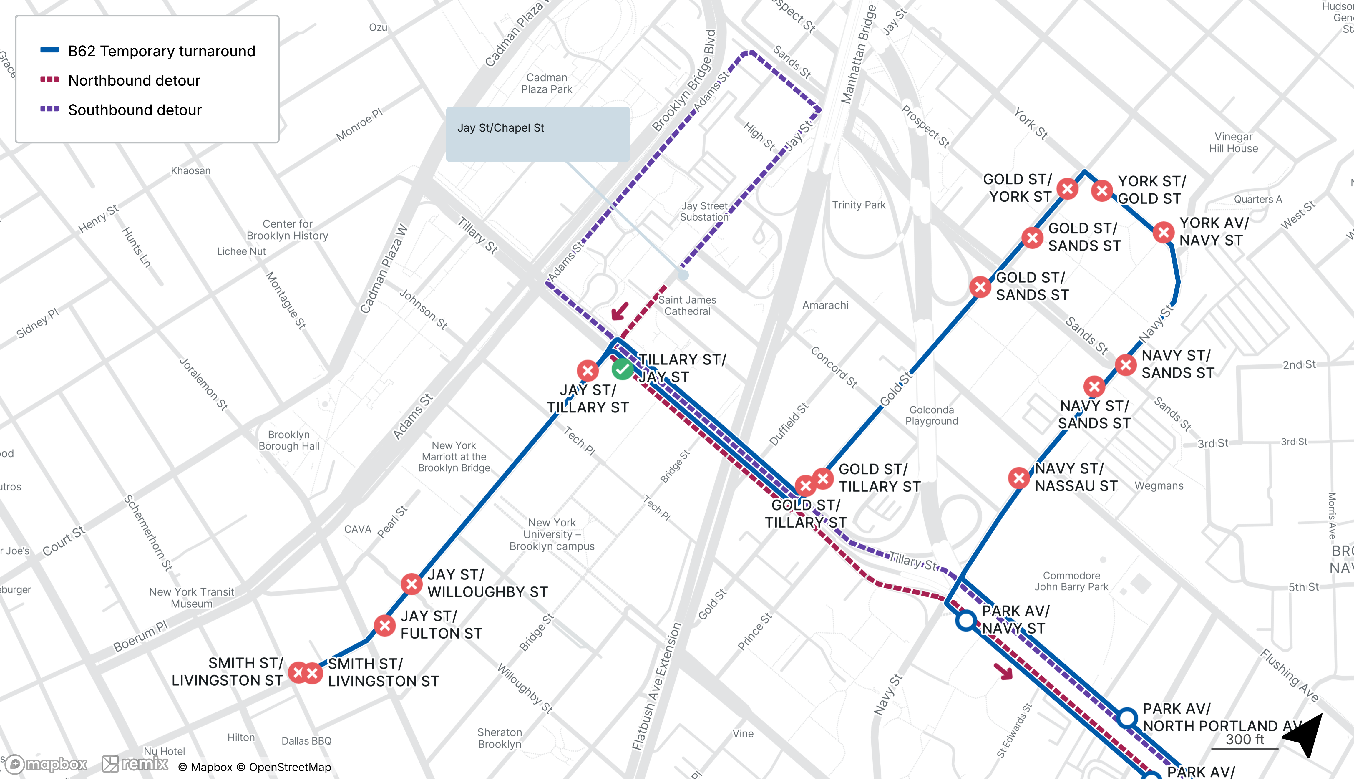 Temporary turnaround downtown Brooklyn, first and last temporary stop will be made on Jay St at Chapel St (see map)