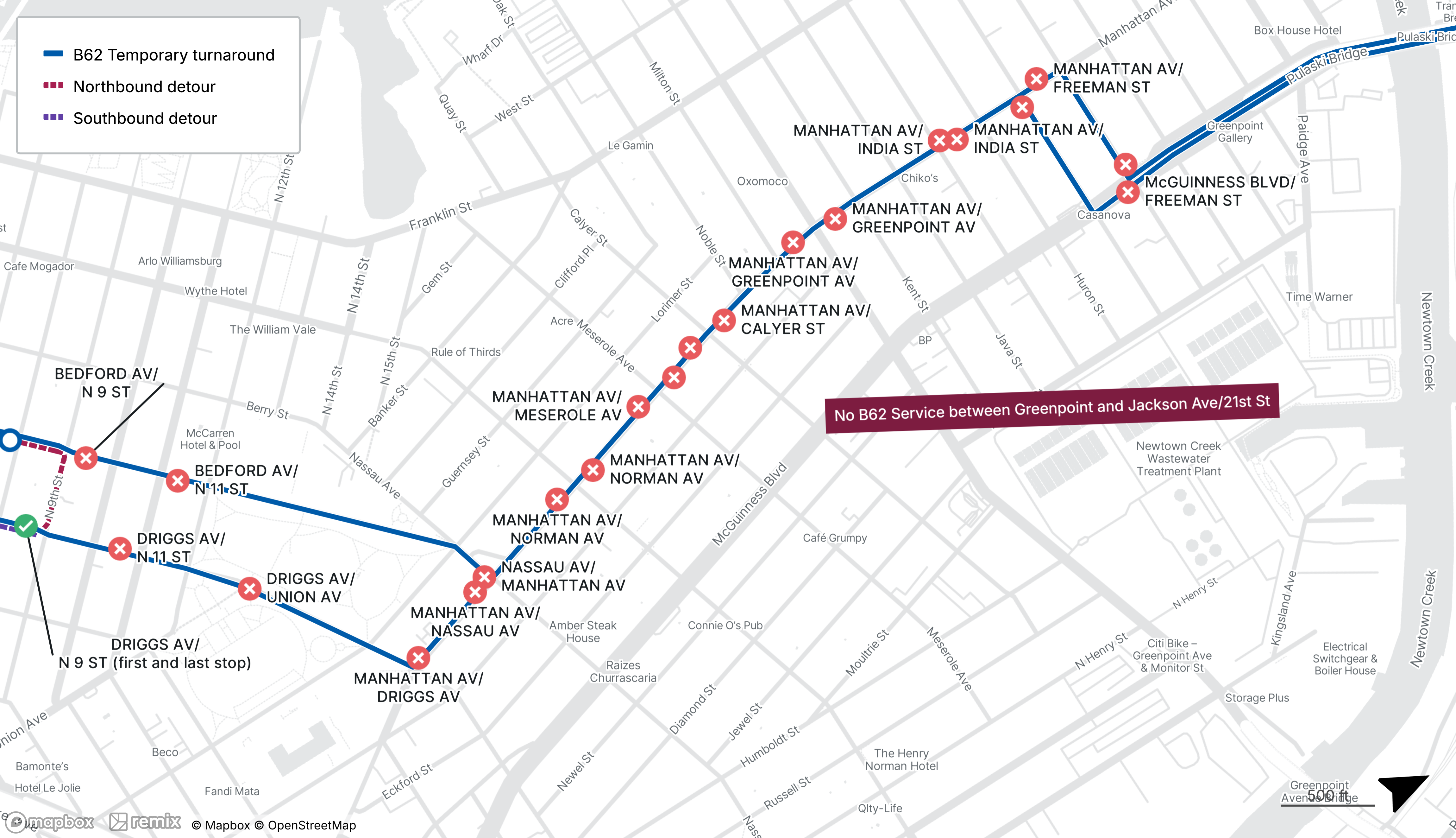 No B62 service between Jackson Ave at 21st St and Driggs Ave at N 9th St, buses also operate in two sections
