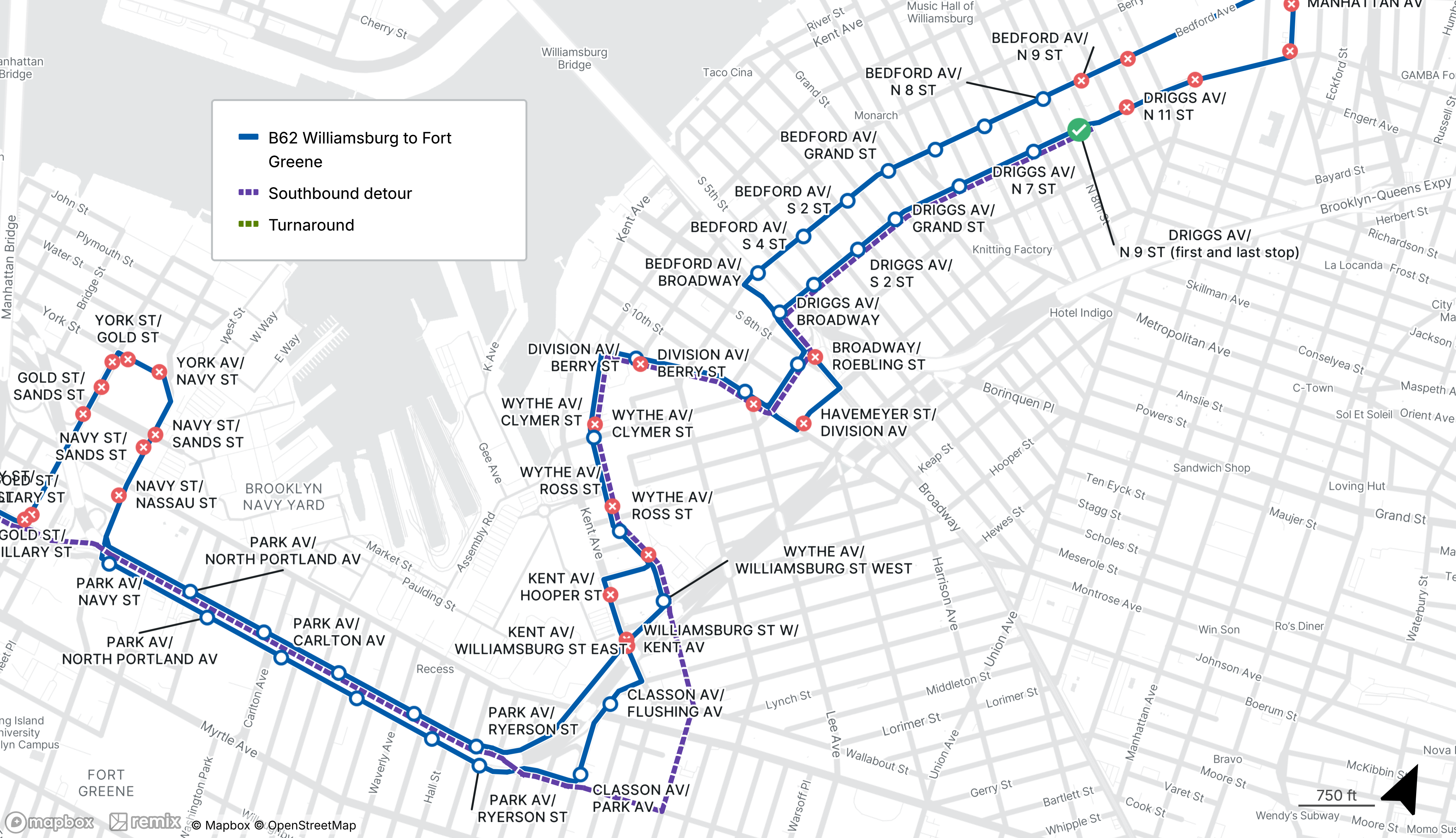 Northbound buses make requested stops along Williamsburg St E and along Bedford Ave to N 9th St.