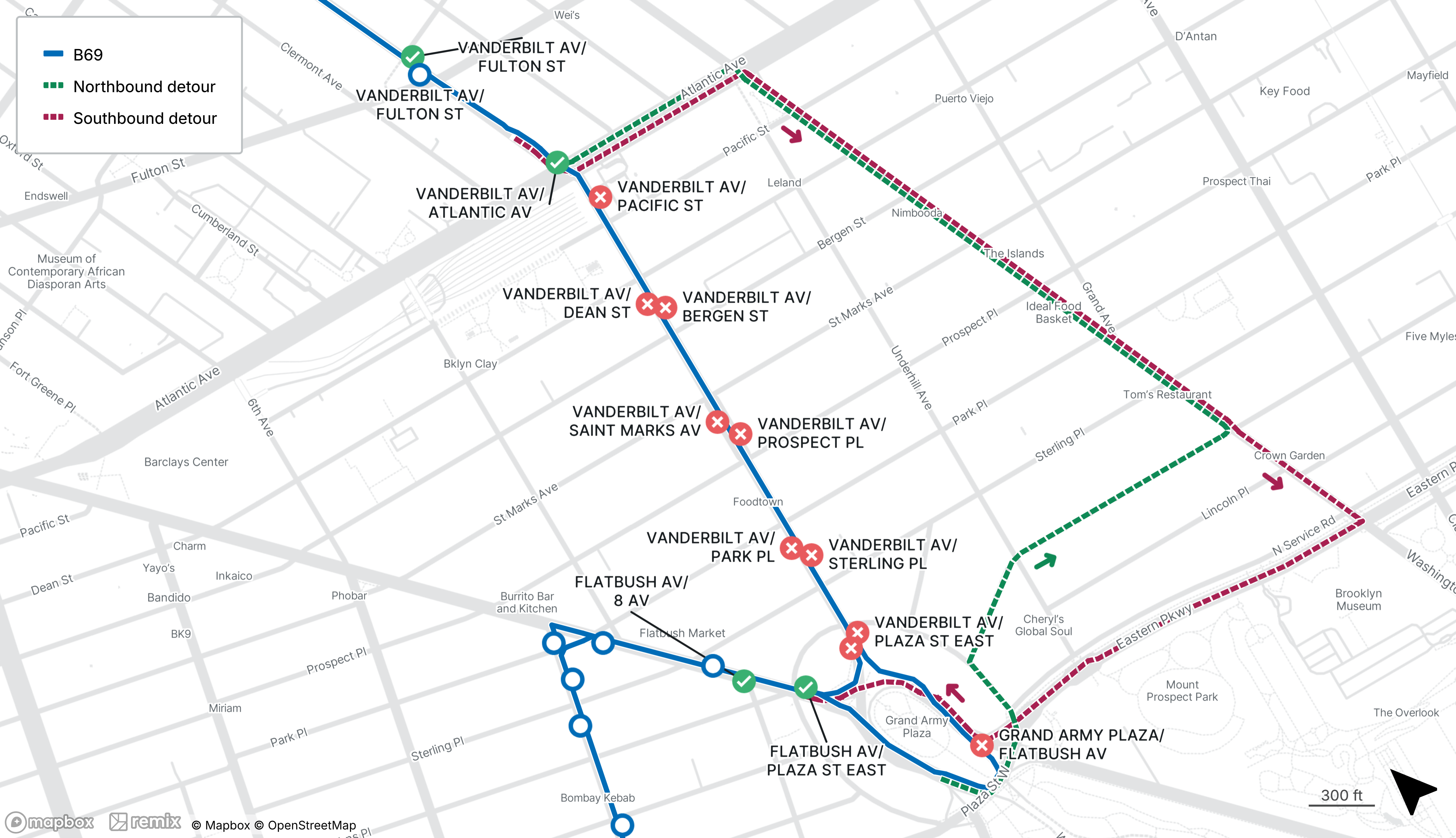 B69 buses will be detoured between Grand Army Plaza at Plaza St W and Vanderbilt Ave at Atlantic Ave