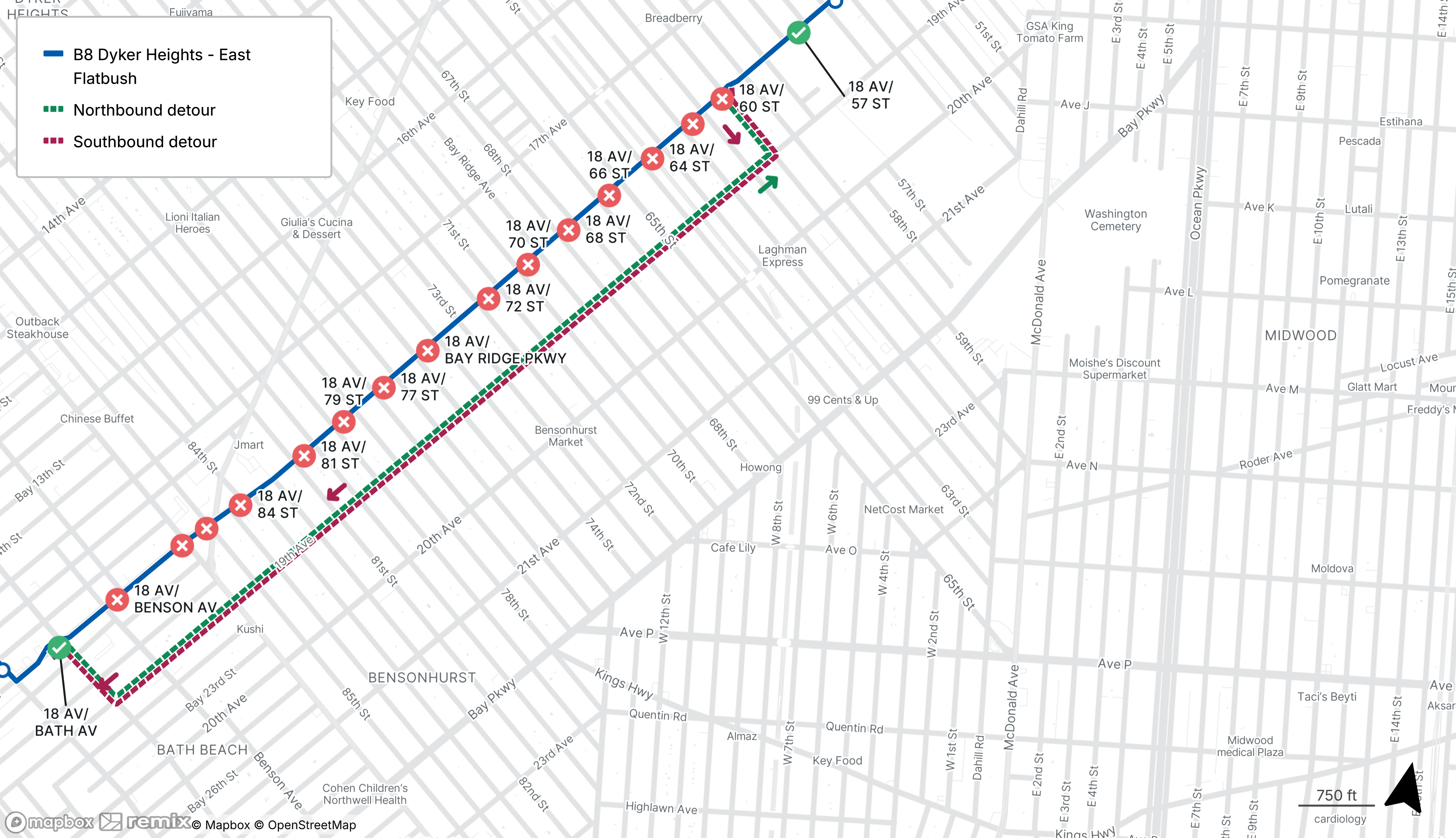 B8 buses will be detoured from 18th Ave between 60th St and Bath Ave
