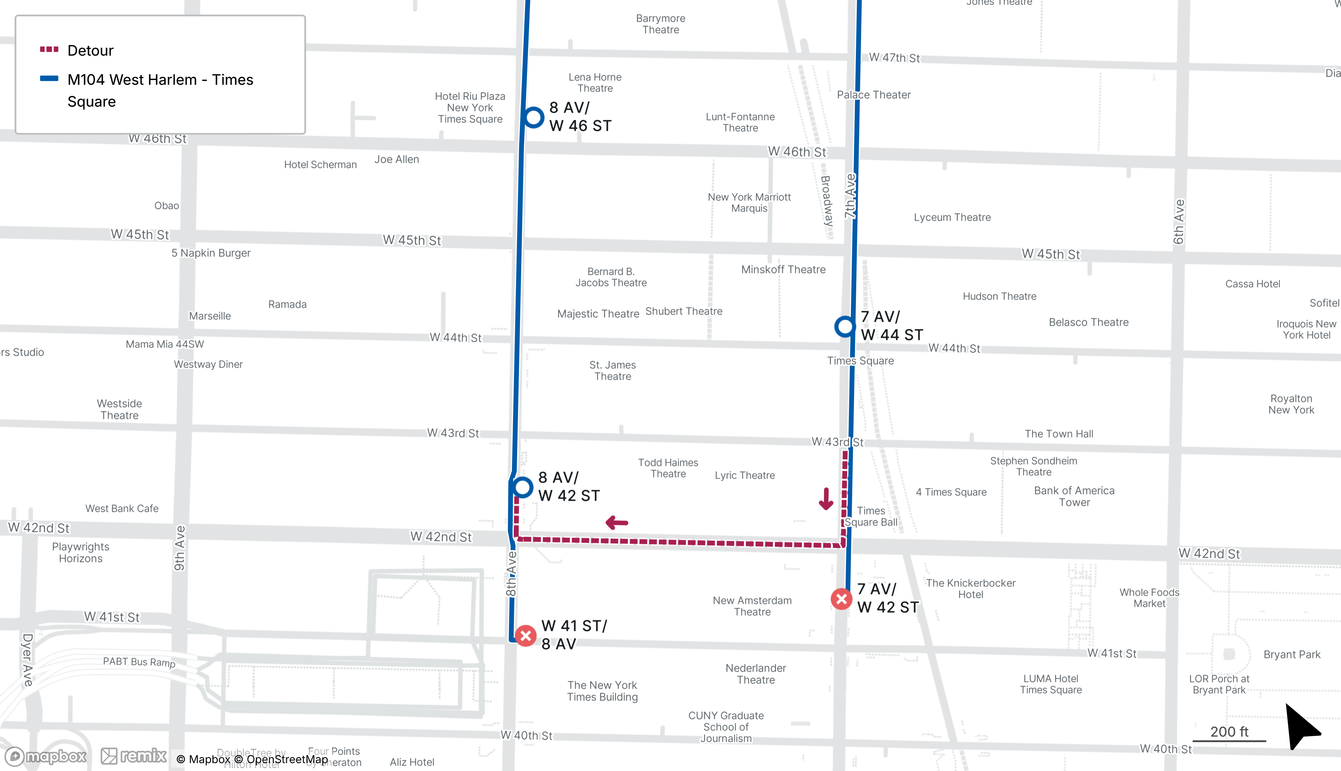 M104 southbound stop on 7th Ave at W 42nd St and the northbound stop on W 41st St at 8th Ave will be closed