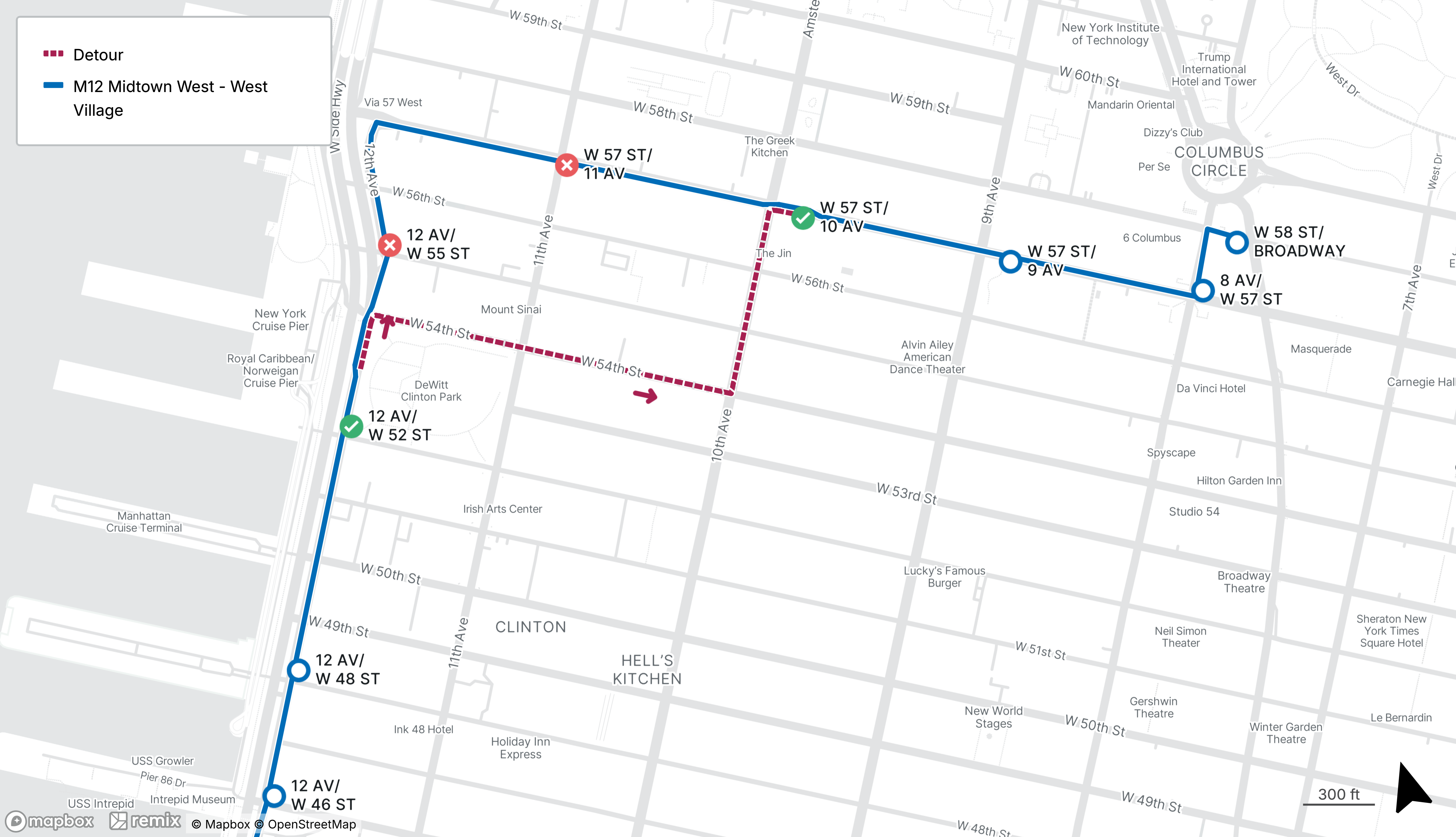 Northbound M12 stops on 12th Ave at W 55th St and W 57th St at 11th Ave will be closed