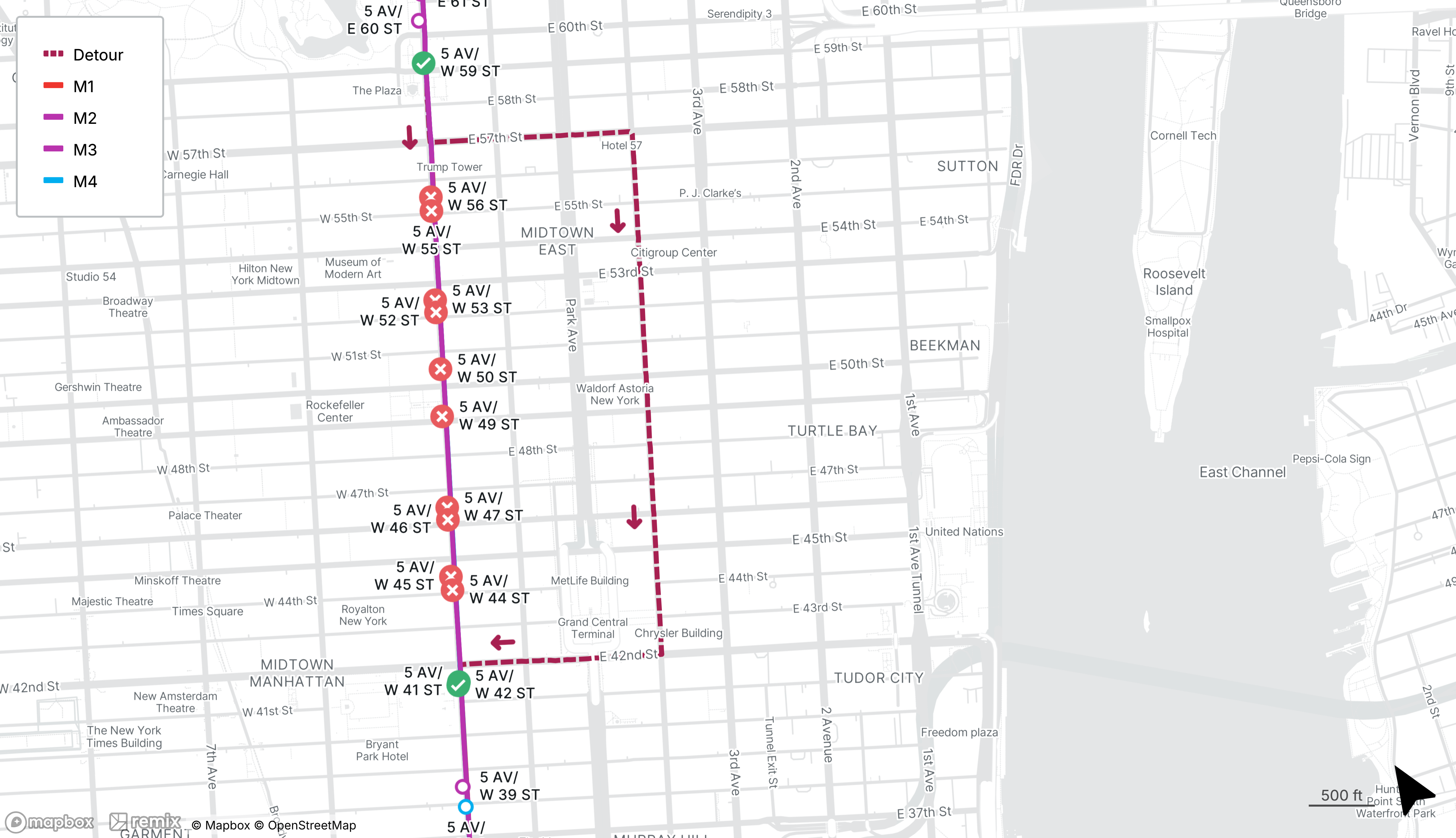 Southbound M1, M2, M3 and M4 stops on 5th Ave from W 56th St to W 44th St will be closed
