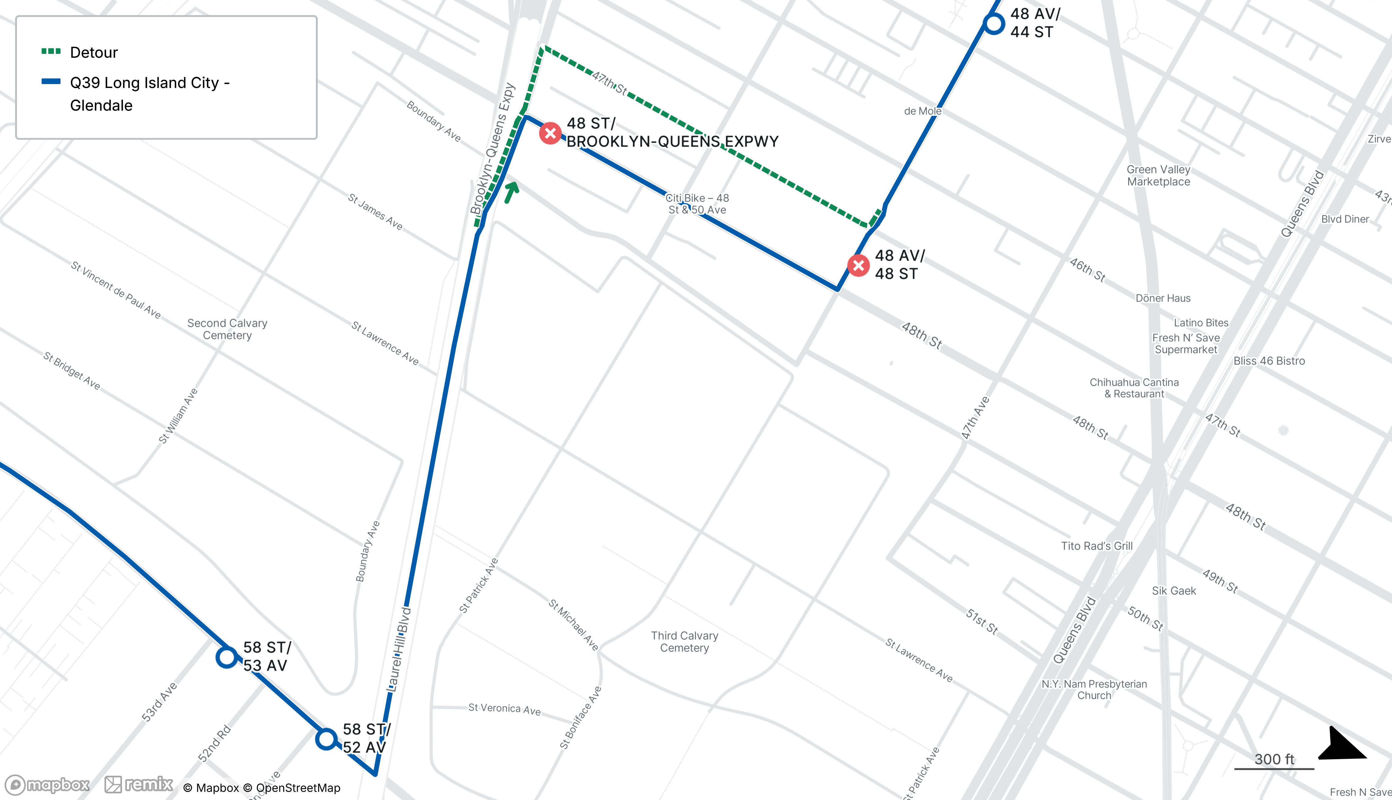 Northbound Q39 stops on 48th St at Brooklyn-Queens Expwy and 48th Ave at 48th St will be closed
