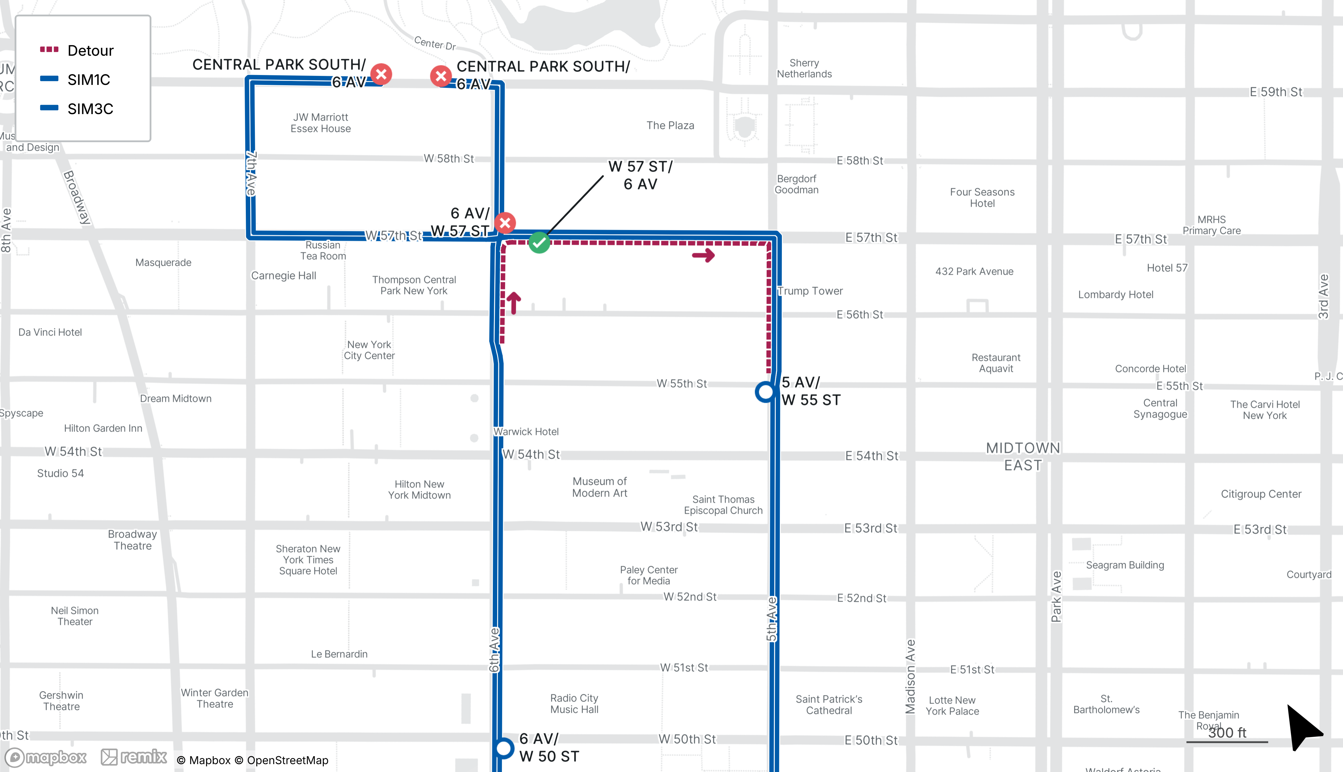 SIM1C and SIM3C stops on Central Park South at 6th Ave and northbound on 6th Ave at W 57th St will be closed