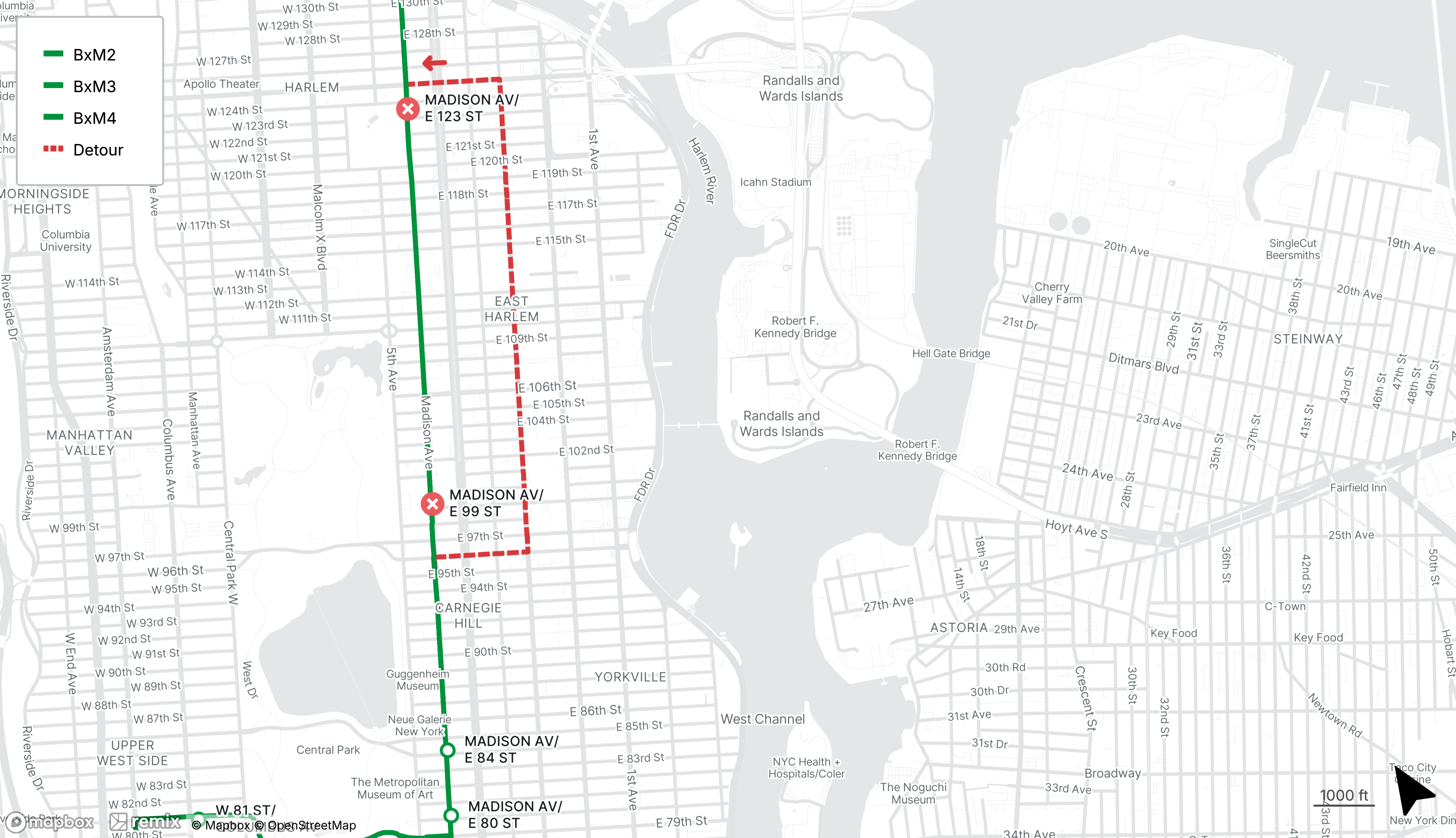 Northbound BxM2, BxM3 and BxM4 stops on Madison Ave at E 99th St and E 123rd St will be closed