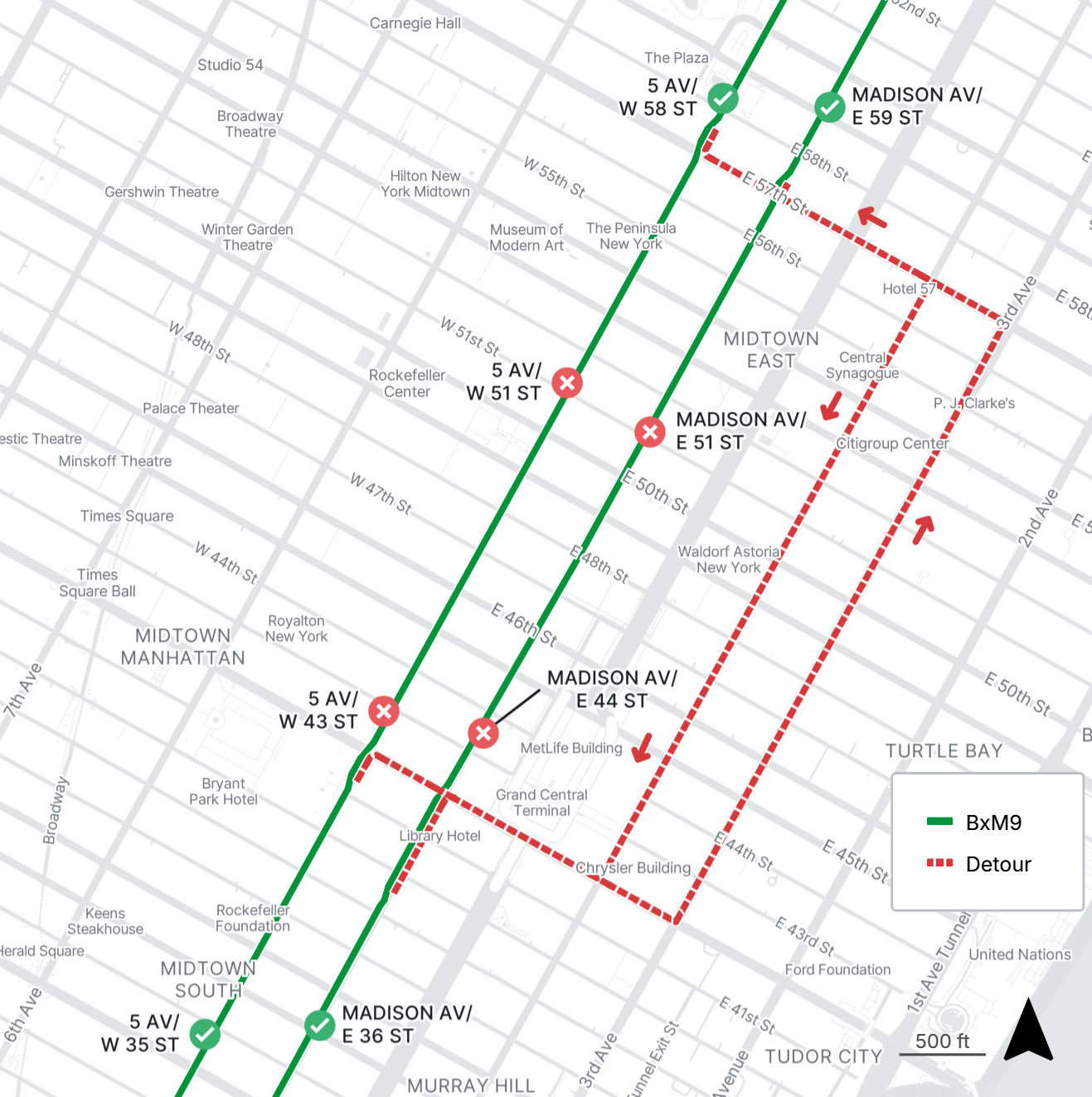 BxM9 northbound stops on Madison Ave at E 44th St and E 51st St, and southbound stops on 5th Ave at W 51st St and W 43rd St are closed