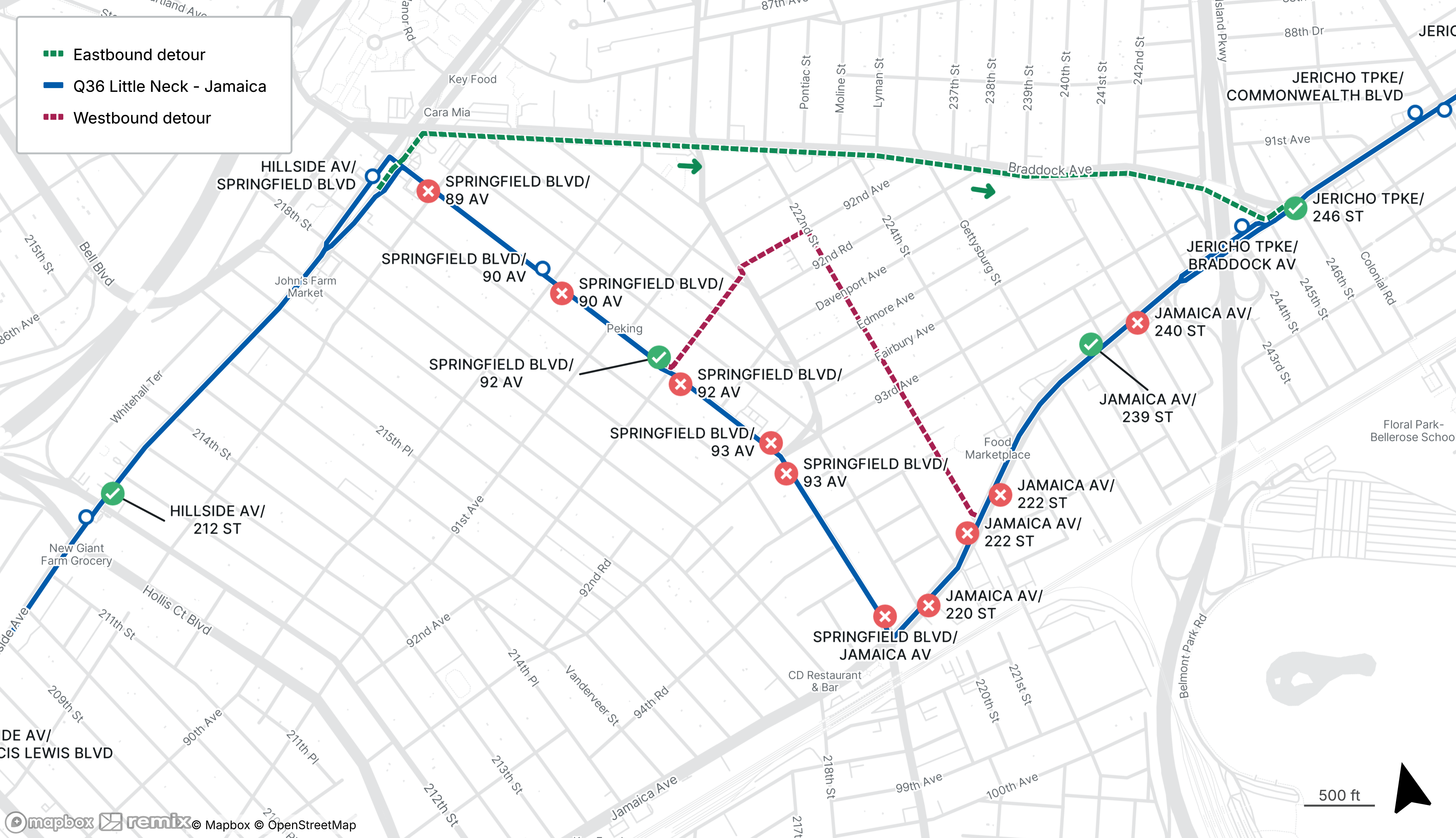 For westbound service, use the stops Jamaica Ave at 239th St or Springfield Blvd at 92nd Ave.