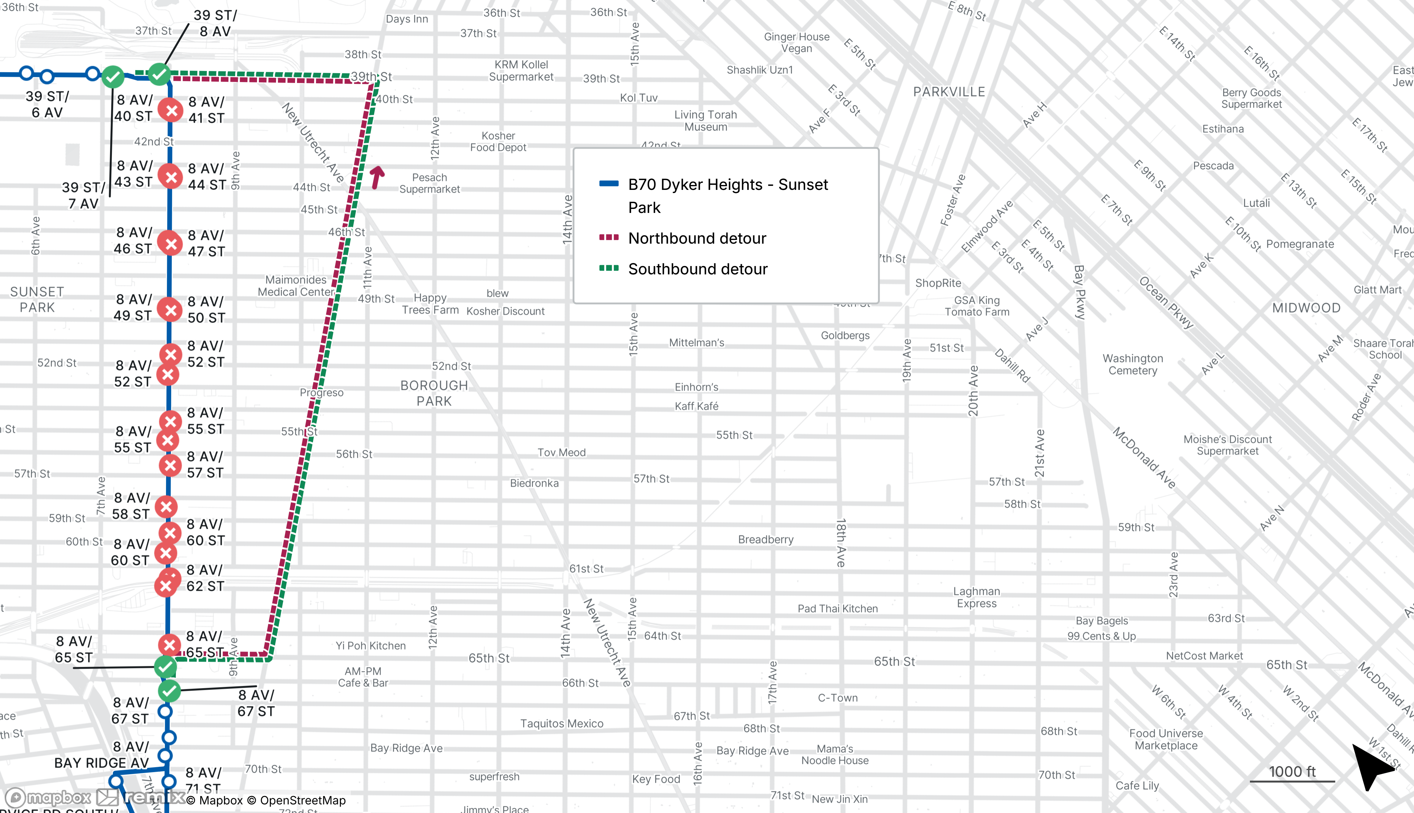 B8 buses will be detoured from 18th Ave between Ocean Parkway and Dahill Rd