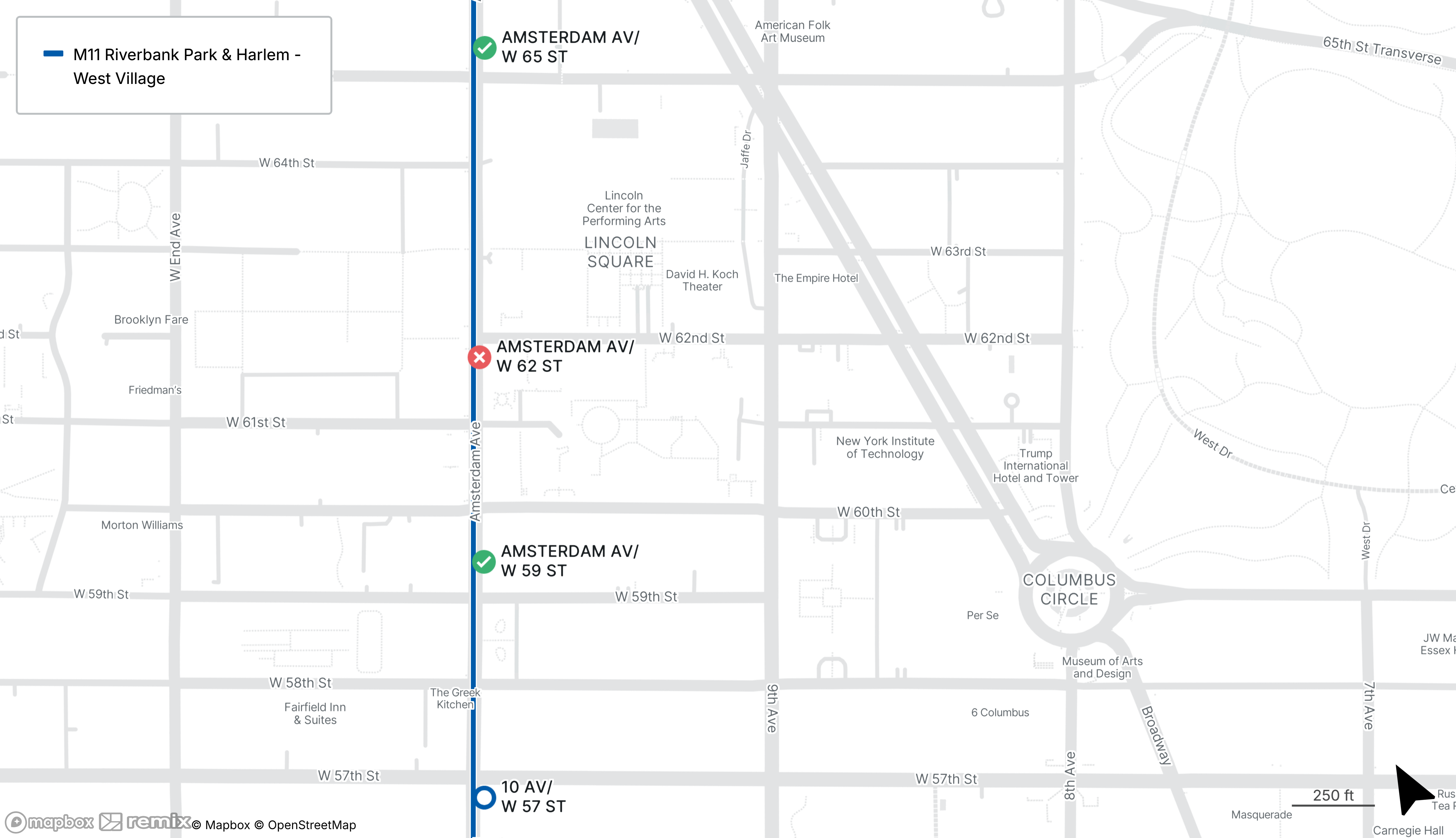 Northbound M11 buses are bypassing the stop on Amsterdam Ave at W 62nd St, use the stops on Amsterdam Ave at W 59th St or W 65th St
