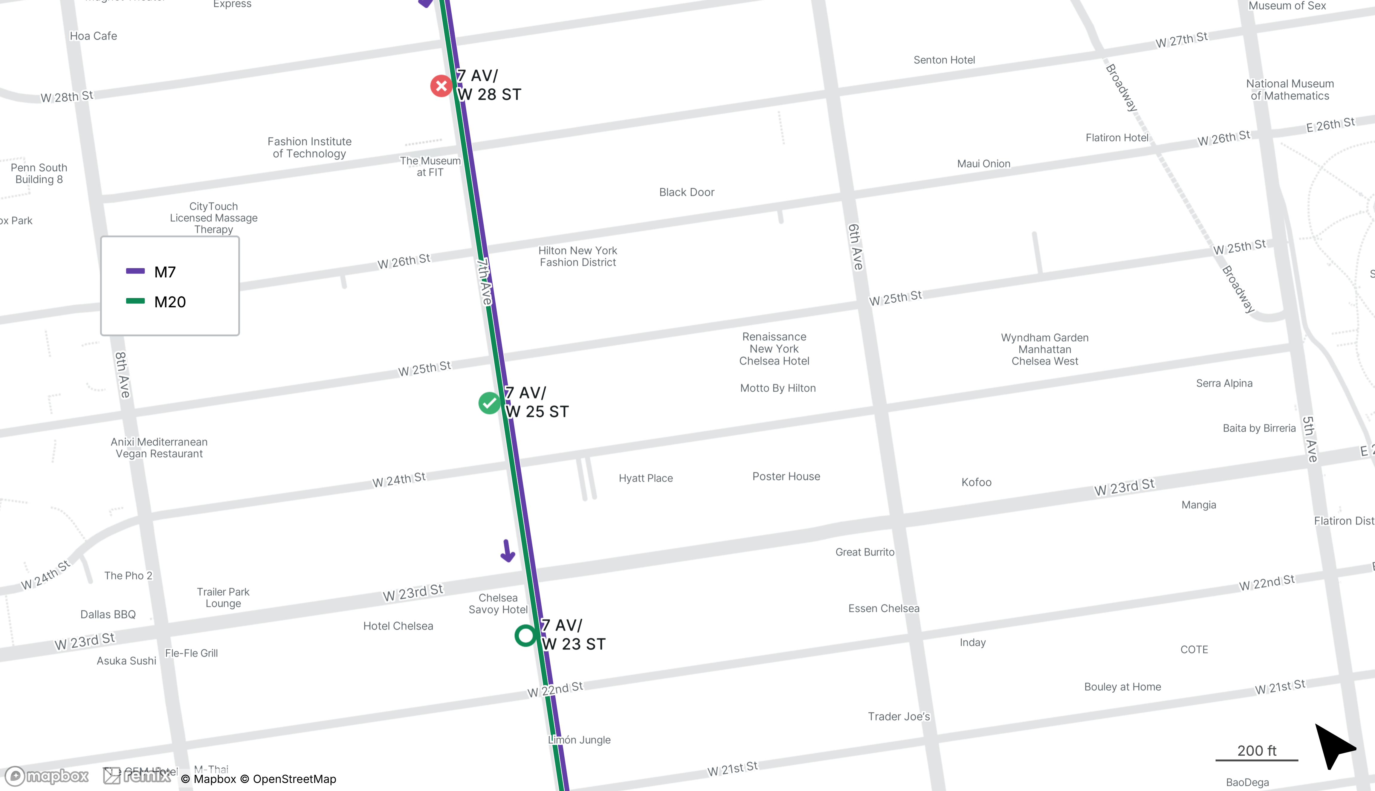 Southbound M7 and M20 stop on 7th Ave at W 28th St will be bypassed, use the stop on 7th Ave at W 25th St
