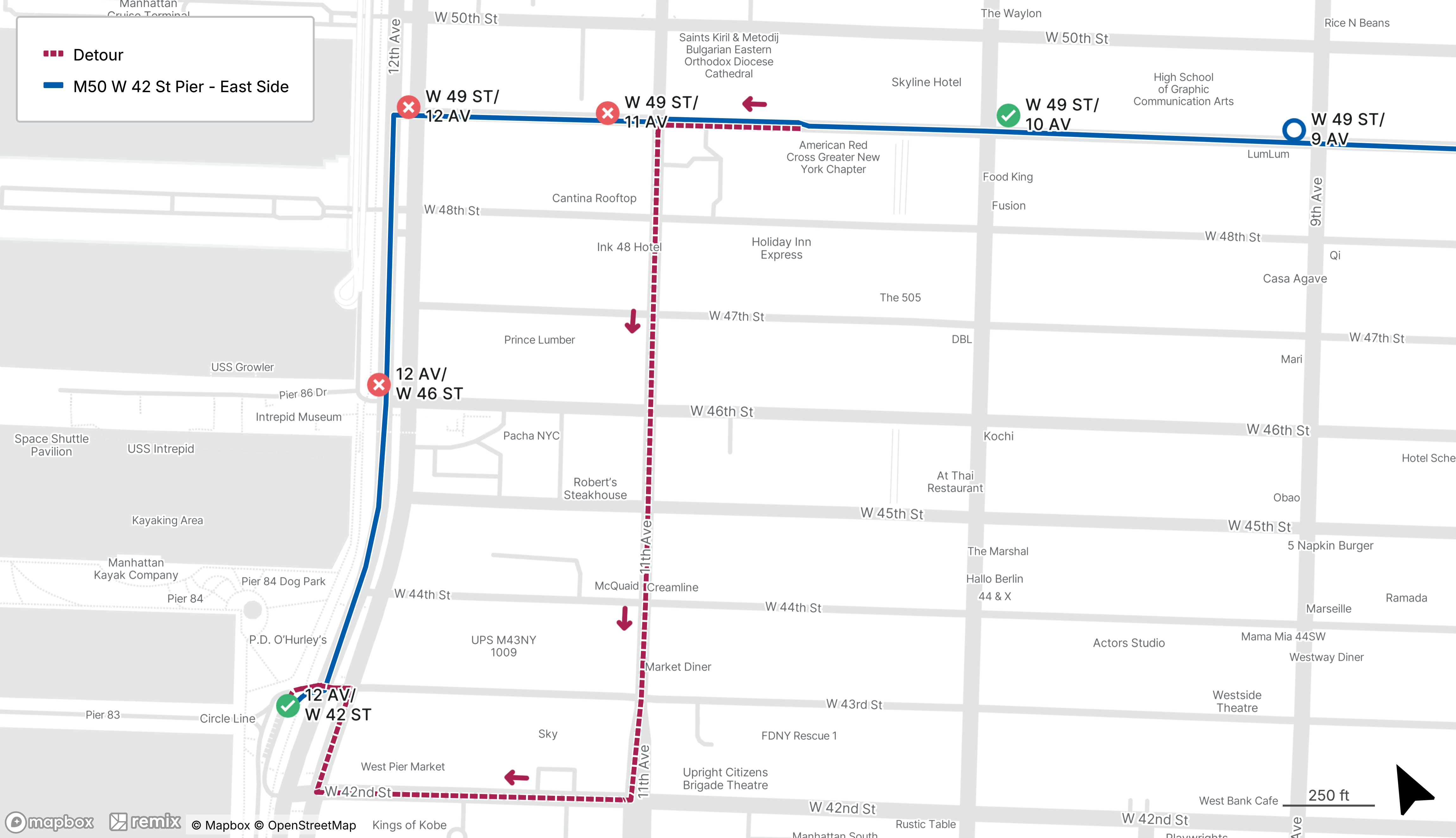 Westbound M50 stops on W 49th St at 11th Ave and 12th Ave and on 12th Ave at W 46th St will be closed