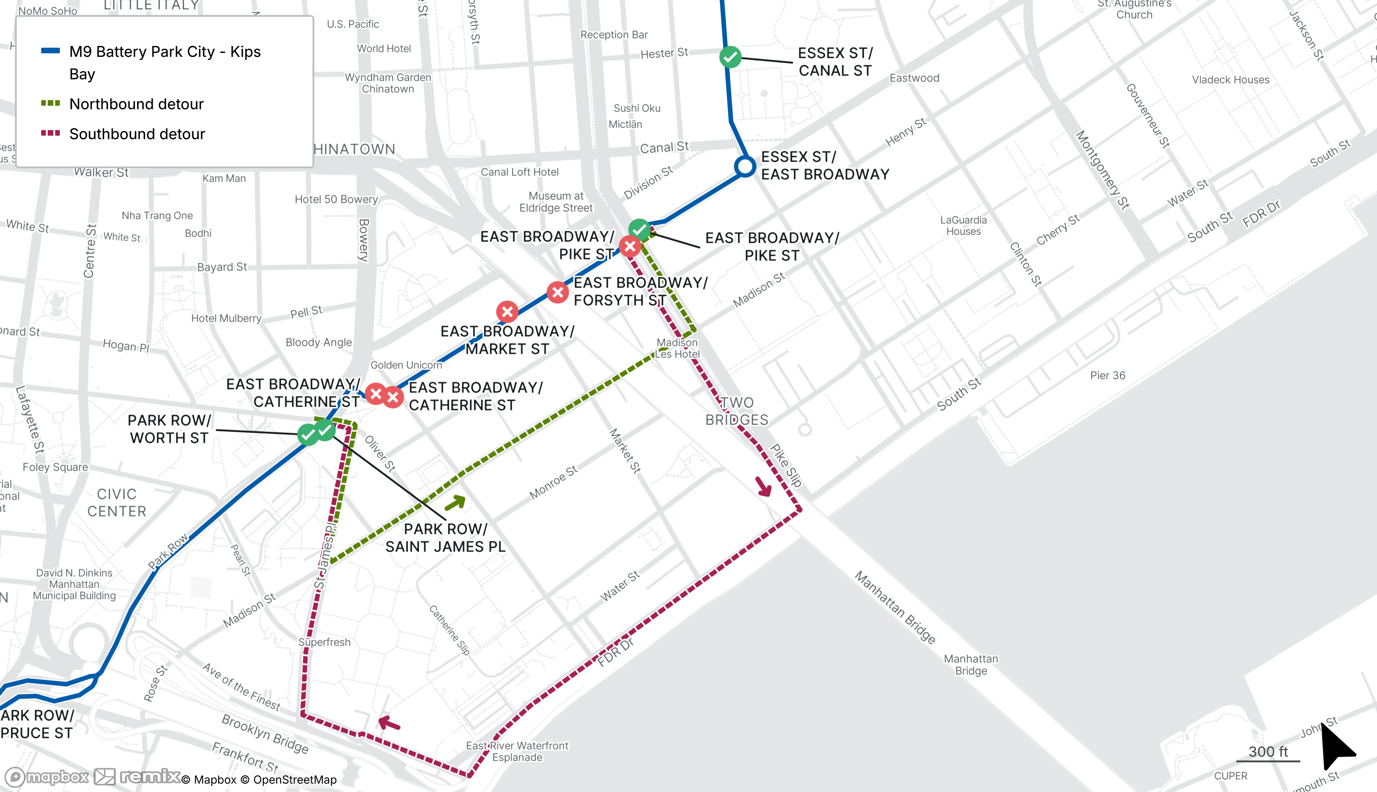 M9 buses will be detoured between East Broadway at Pike St and Park Row at Oliver St