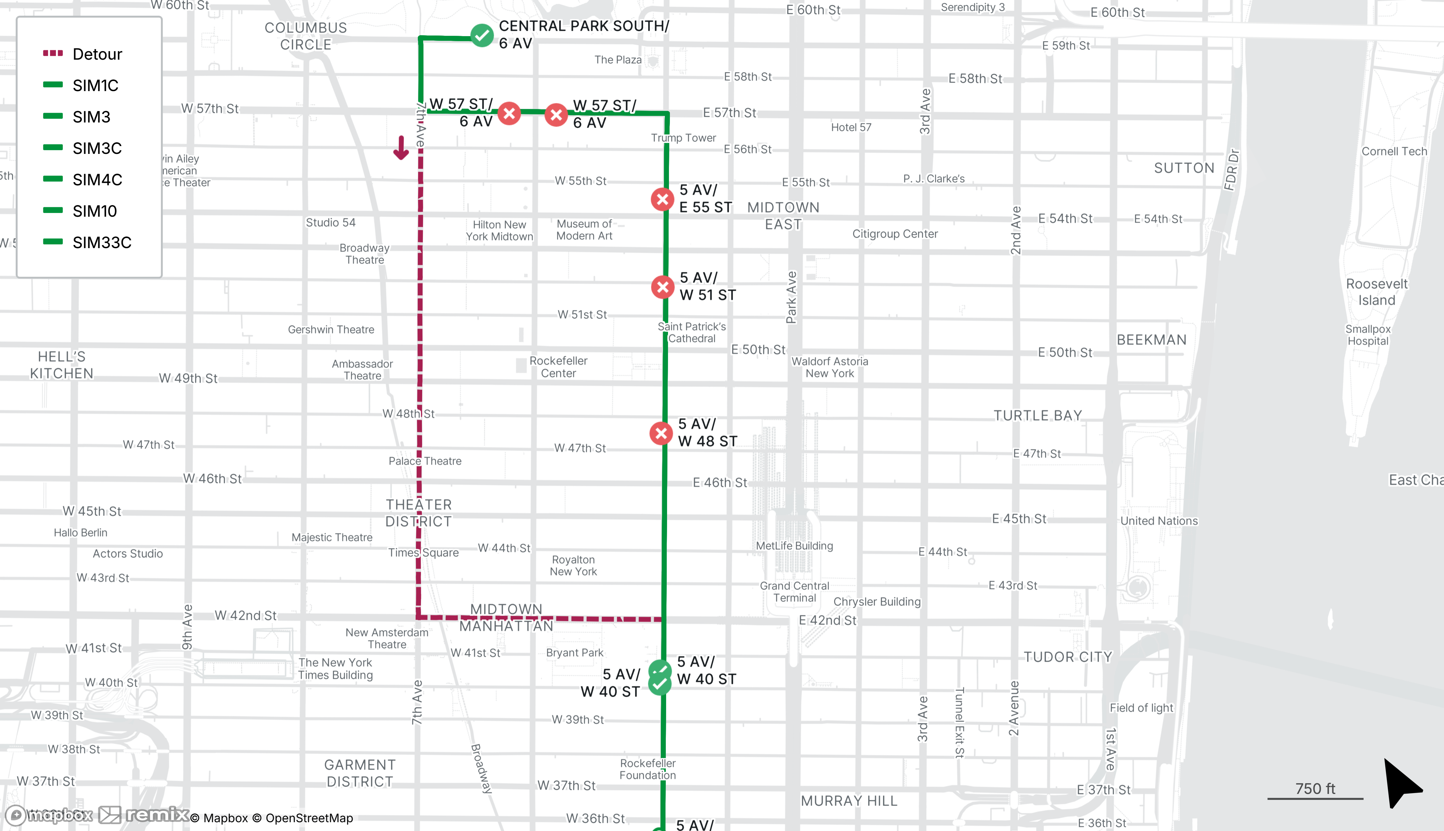 Southbound SIM3, SIM10, SIM1C, SIM3C, SIM4C and SIM33C stops on W 57th St at 6th Ave and along 5th Ave from E 55th St to W 48th St will be closed