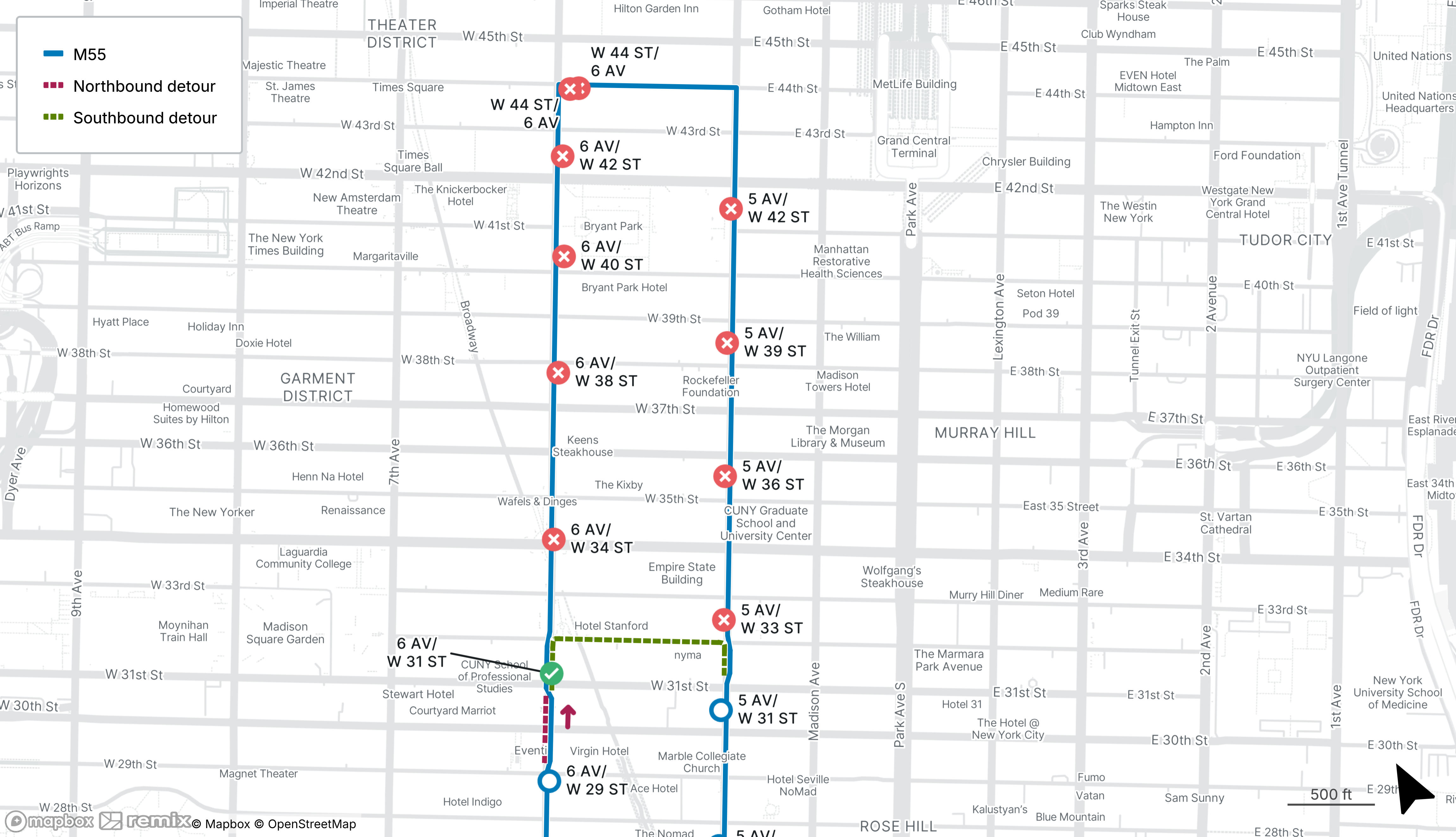 The last northbound M55 stop before the detour will be made on 6th Ave at W 20th St.