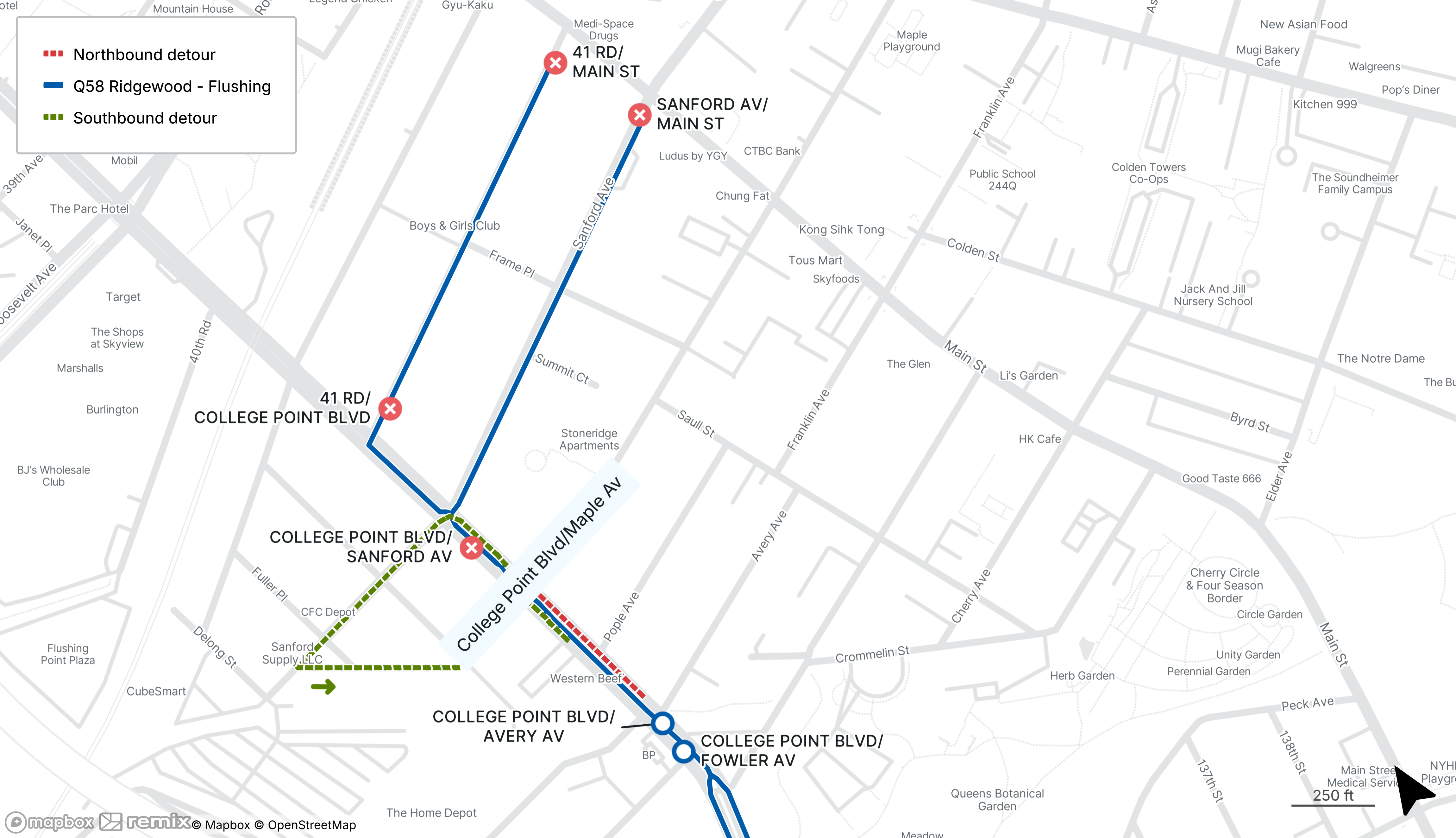 Q58 buses will be detoured between 41st Rd/Sanford Ave at Main St and College Point Blvd at Maple Ave