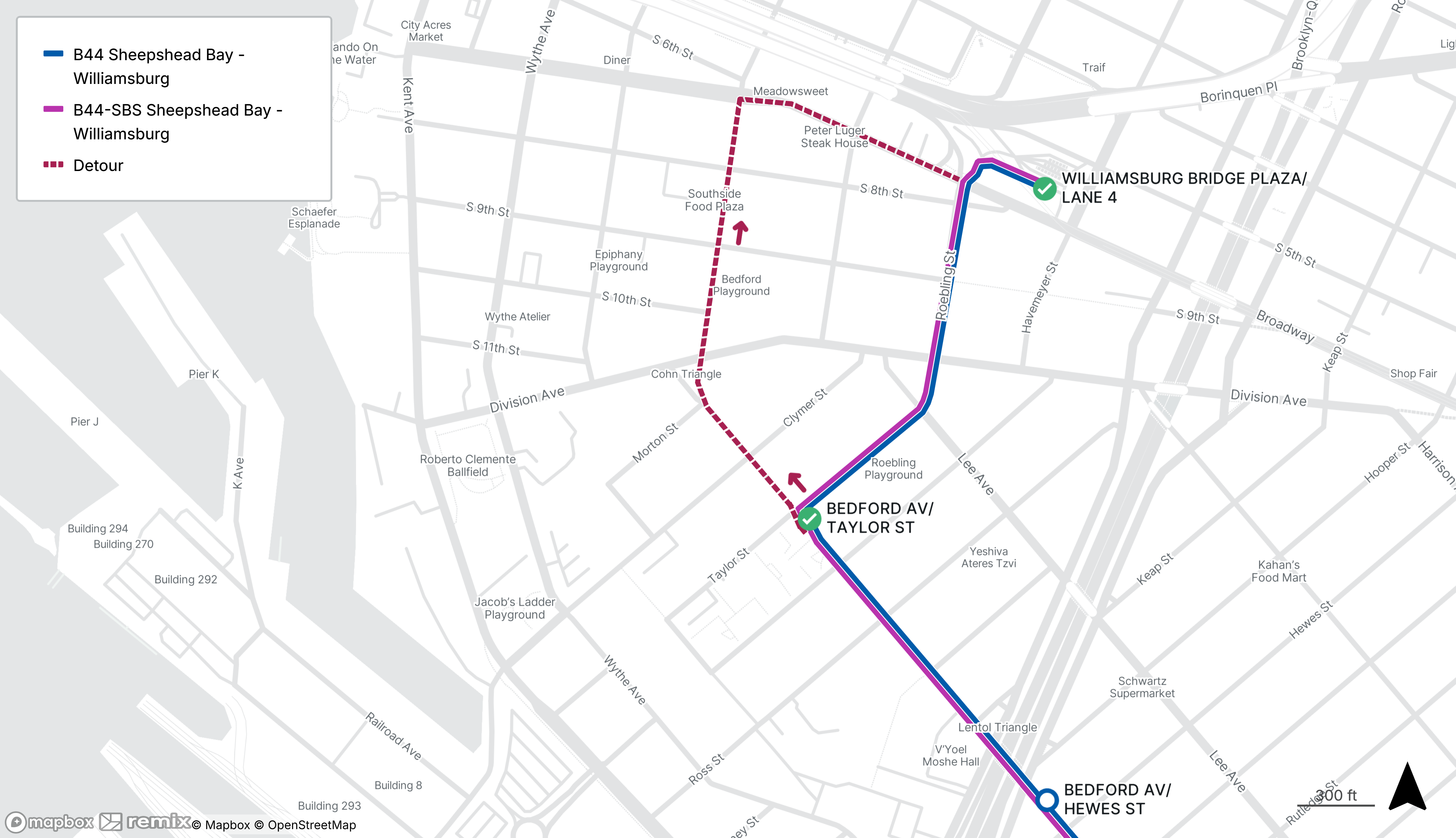 Northbound B44 and B44-SBS buses will be detoured from Bedford St at Taylor St to Broadway at Roebling St - no stops will be missed