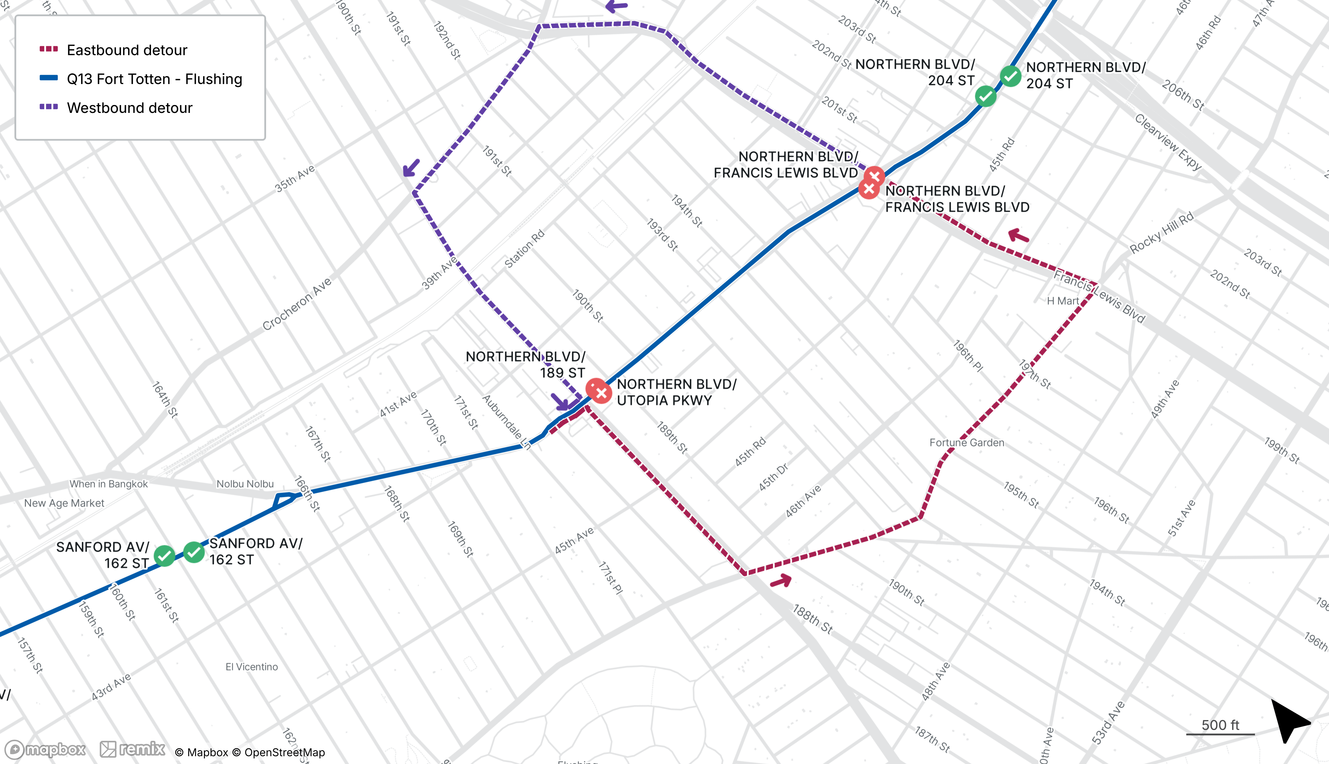 Q13 buses will be detoured from Northern Blvd between Francis Lewis Blvd and Utopia Parkway