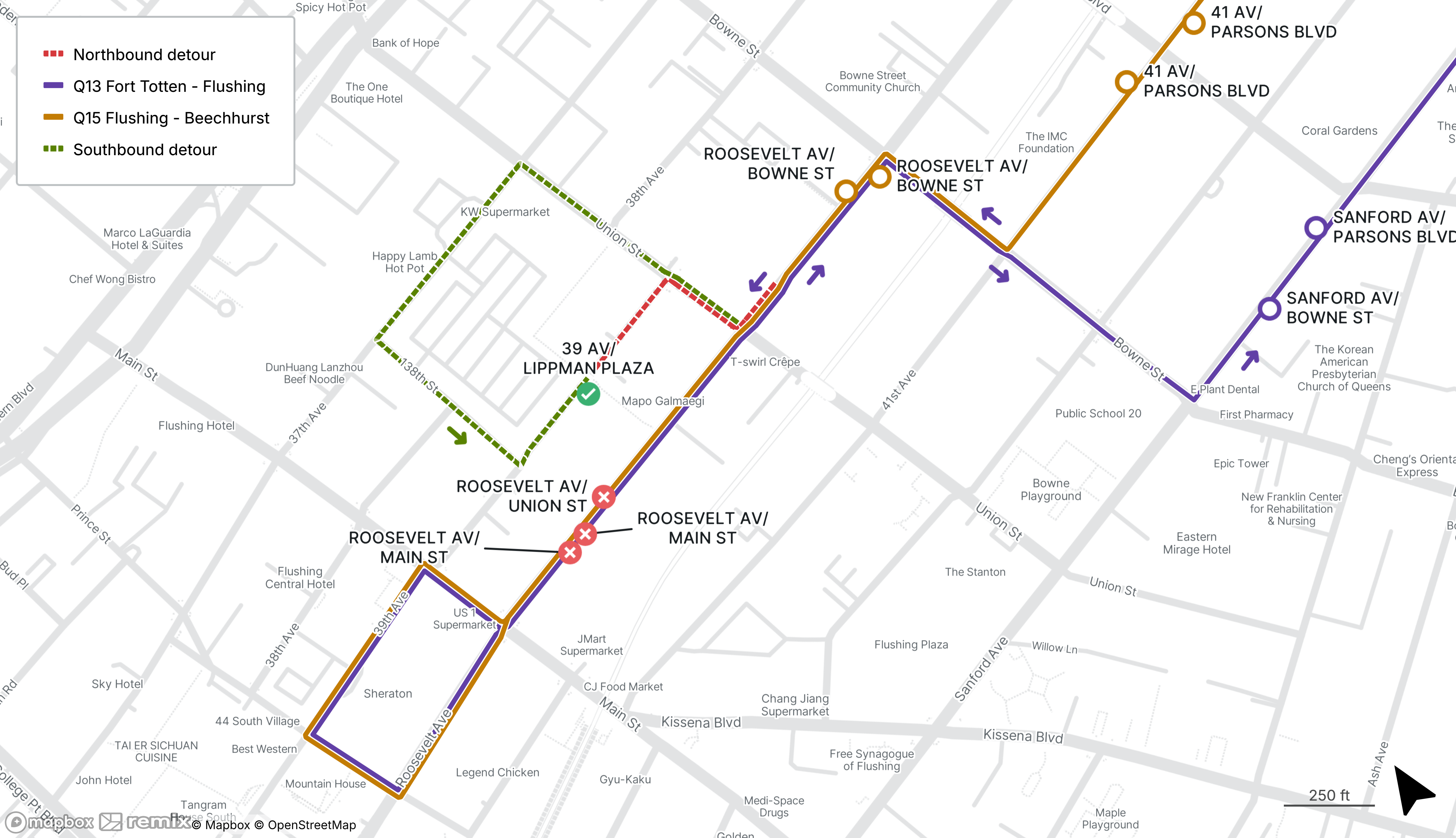 Q13 and Q15 buses will be detoured between 39th Ave at Lippman Plaza and Roosevelt Ave at Main St