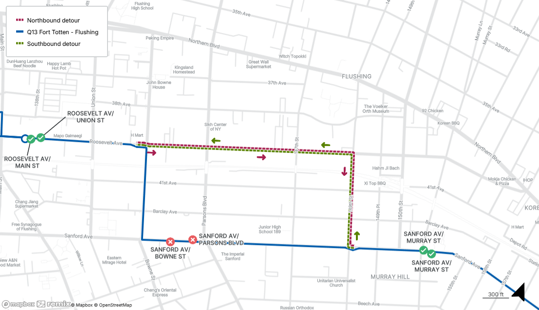 Q13 northbound stop on Sanford St at Bowne St and the southbound stop on Sanford St at Parsons Blvd will be closed