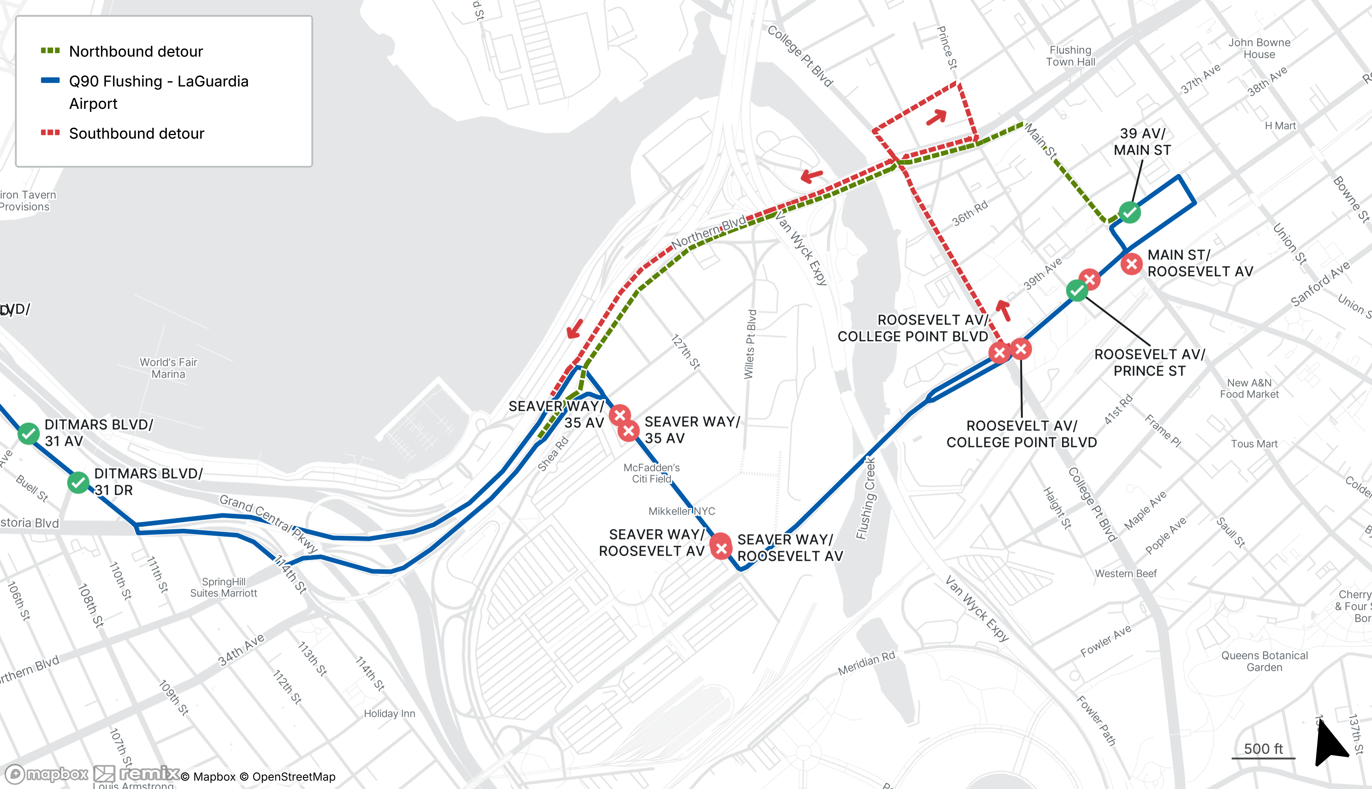Q90 buses will be detoured between Roosevelt Ave at College Point Blvd and Northern Blvd at Main St
