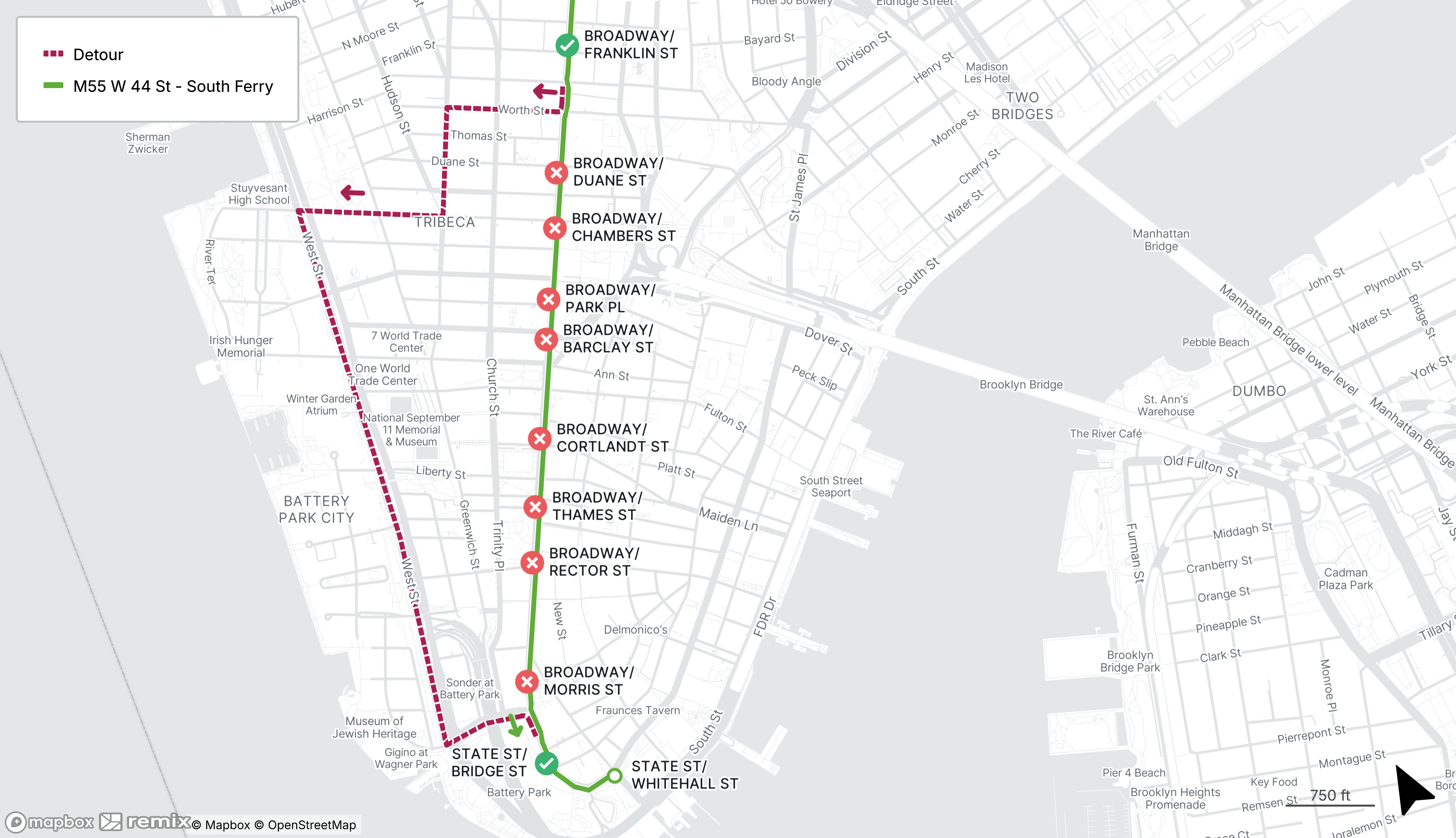 Southbound M55 stops on Broadway from Duane St to Morris St will be closed