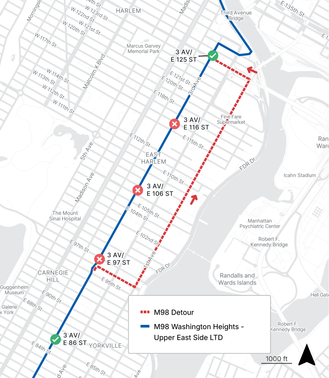 Northbound M98 stops along 3rd Ave from E 97th St to E 116th are closed
