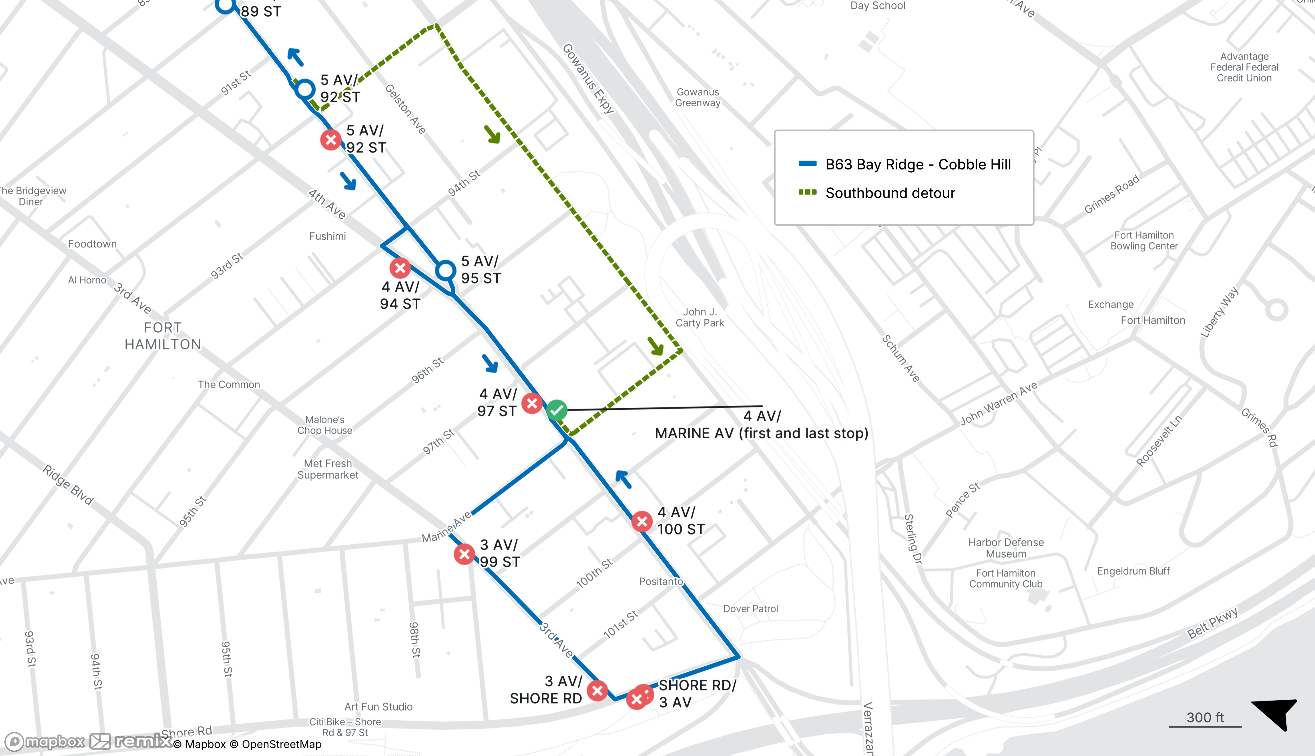 Southbound buses operate via 92nd St, Fort Hamilton Pkwy and Marine Ave. See map