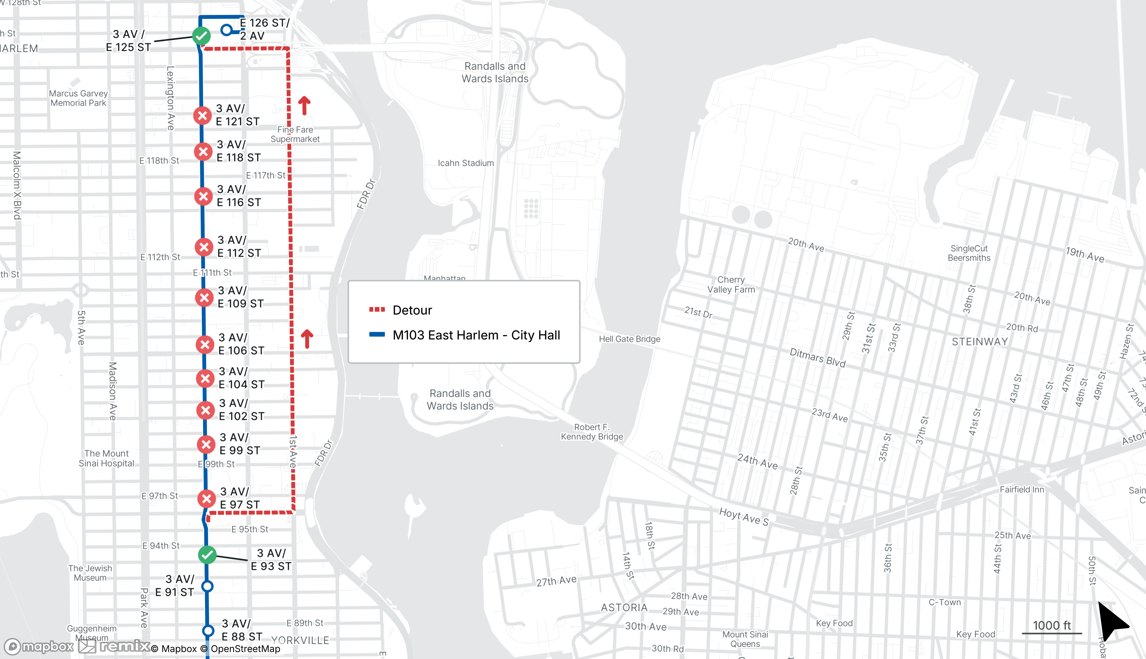 Northbound M103 stops on 3rd Ave from E 97th St to E 121st St will be closed