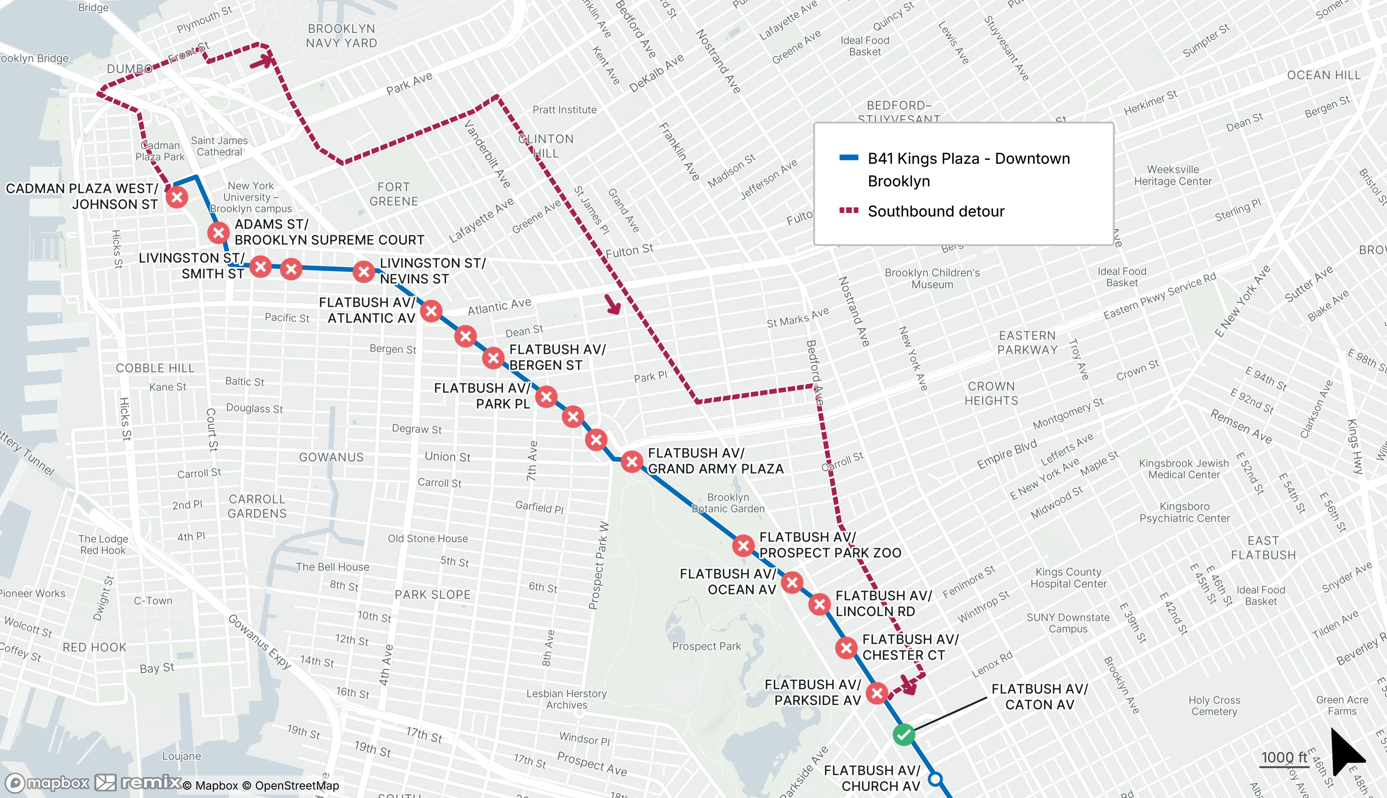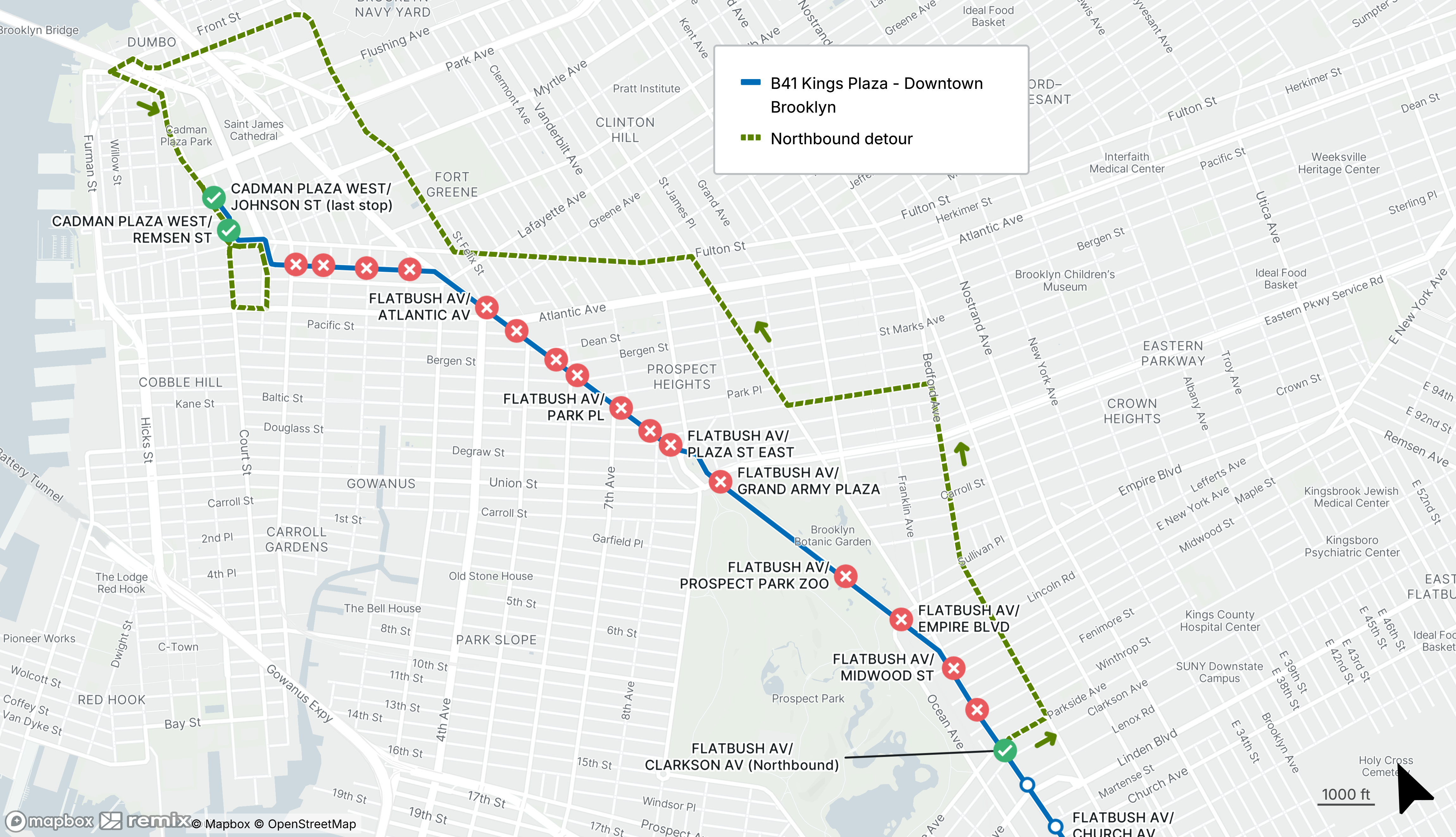 B41 buses will be detoured between Prospect Park and Downtown Brooklyn