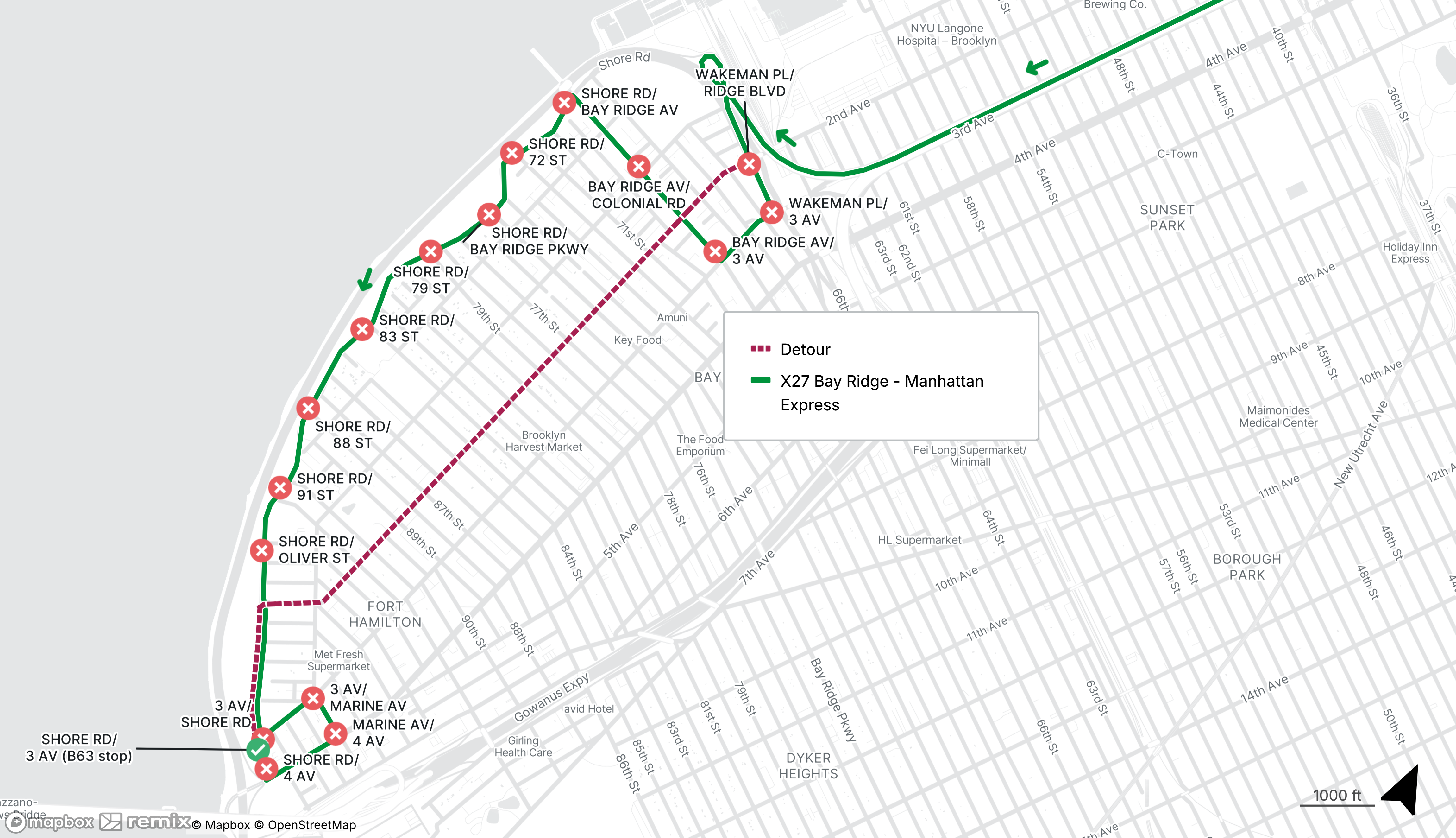Southbound X27 buses will be detoured from Ridge Blvd to Shore Rd at 3rd Ave