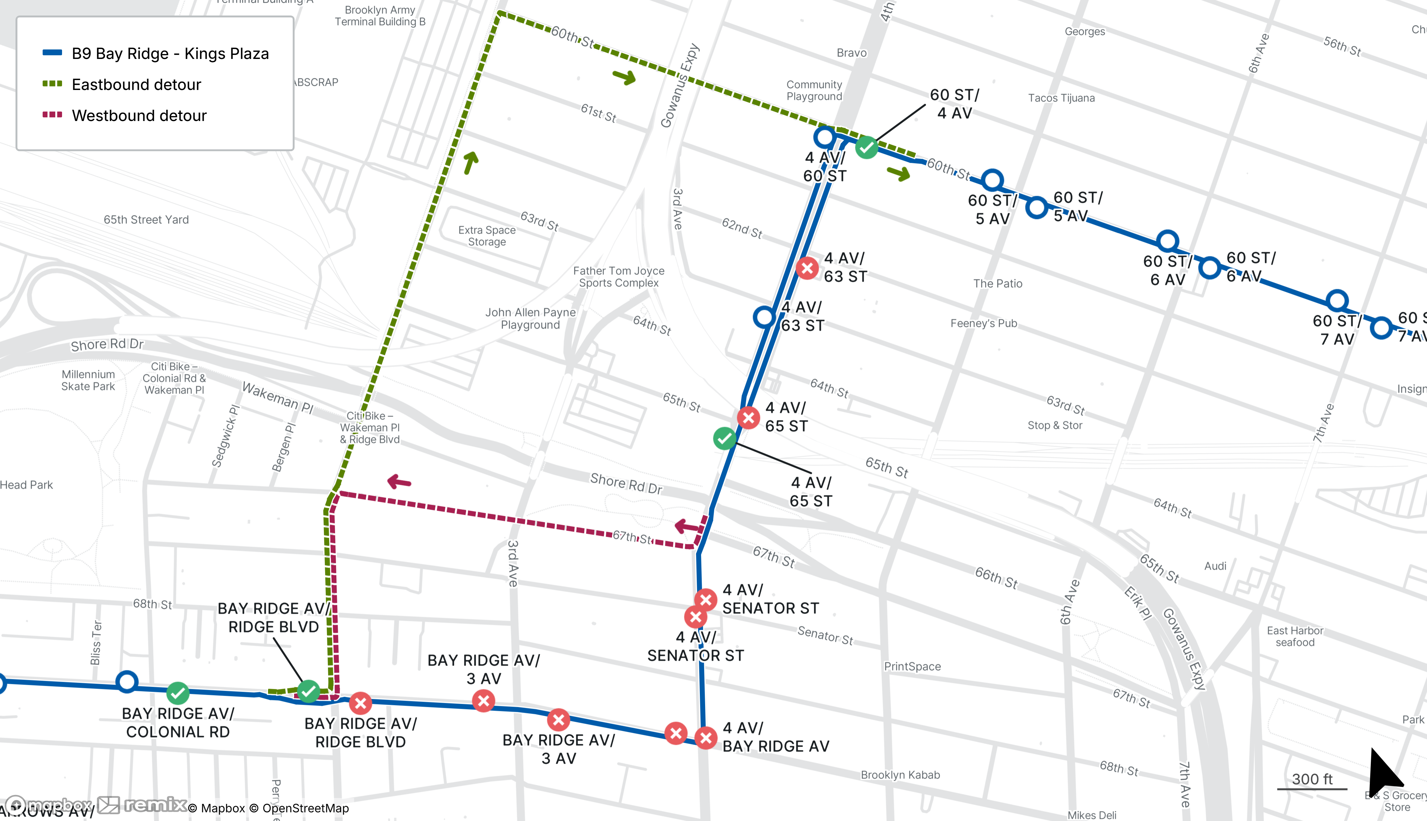 B9 buses will be detoured between 4th Ave at 67th St and Bay Ridge Ave at Ridge Blvd