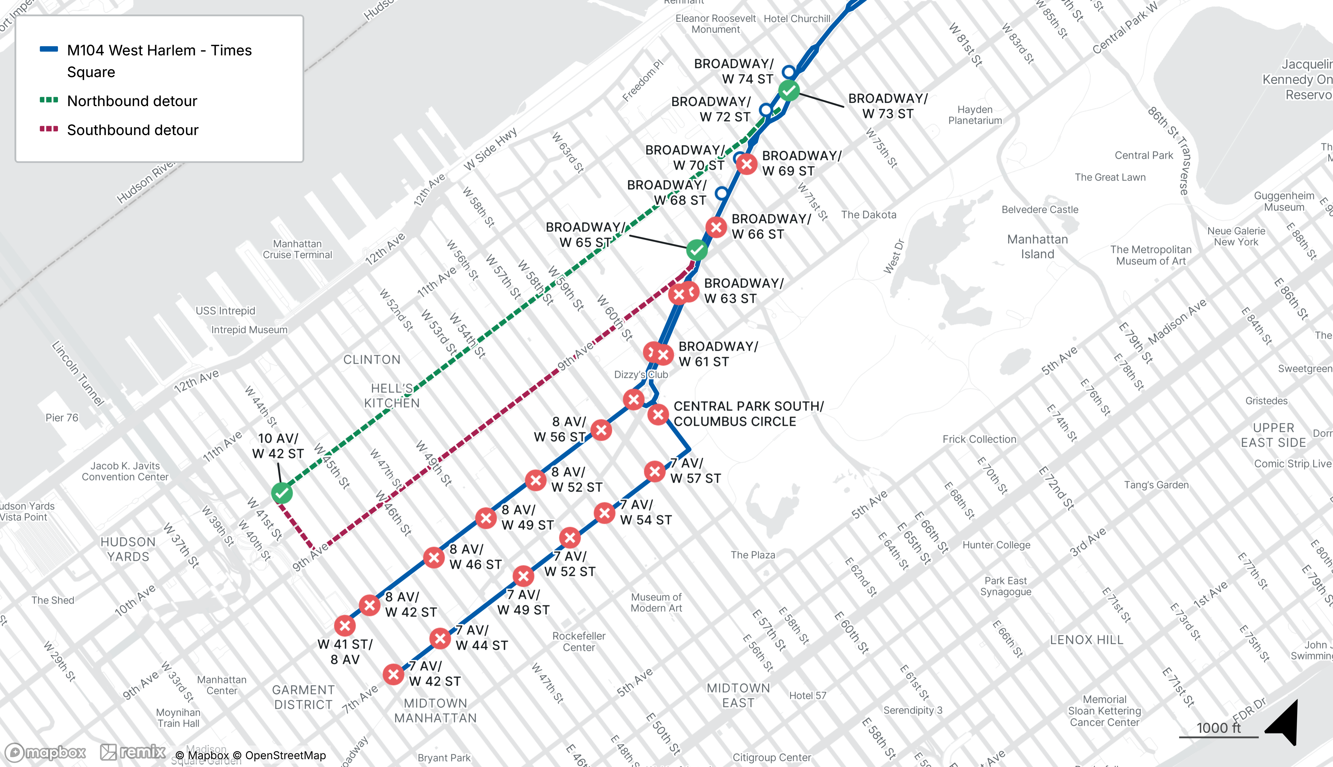 M104 buses will be detoured between Broadway at Columbus Ave and 10th Ave at W 42nd St
