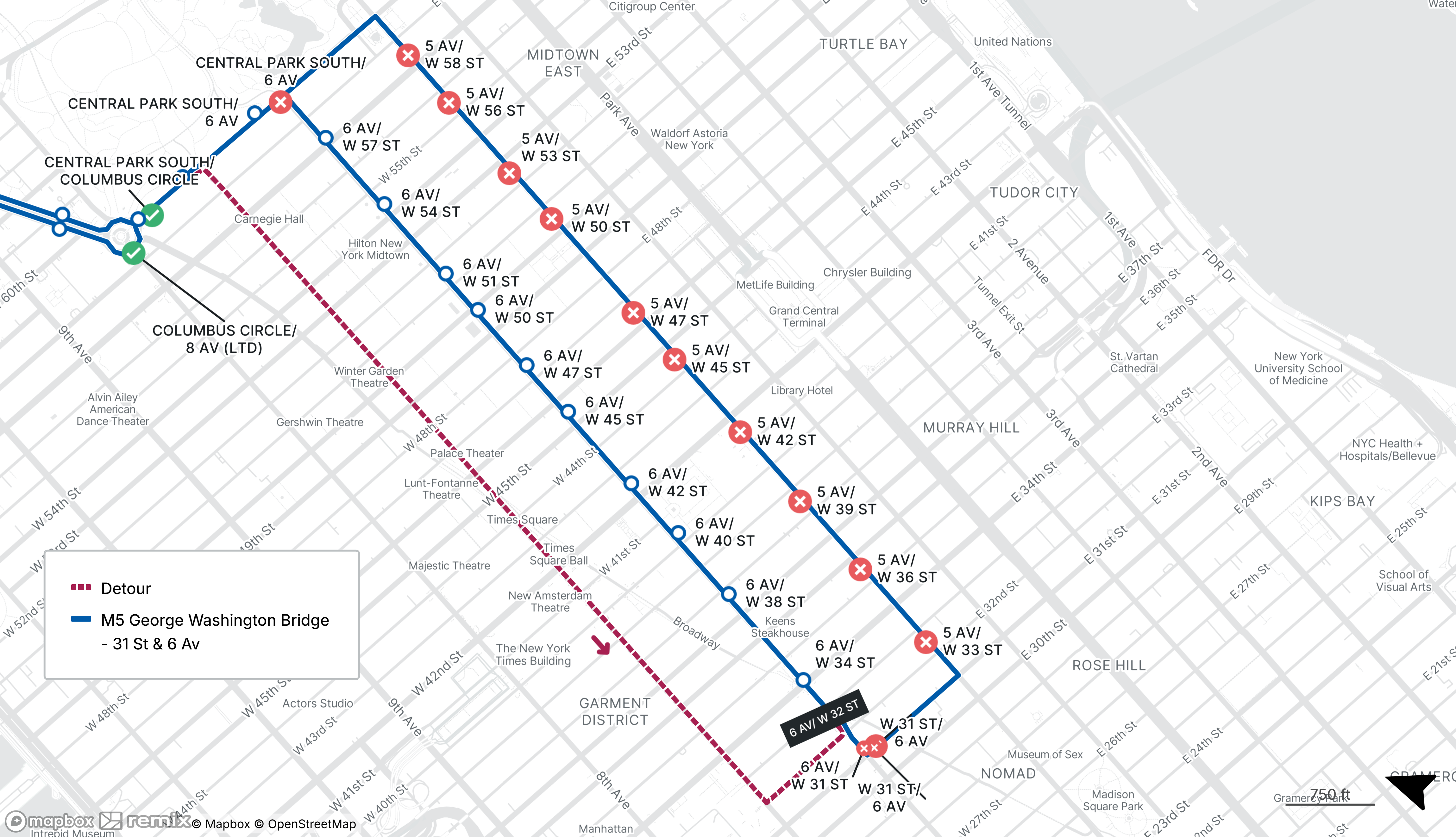 M5 buses will be detoured between W 31st St at 6th Ave and Broadway at Columbus Ave