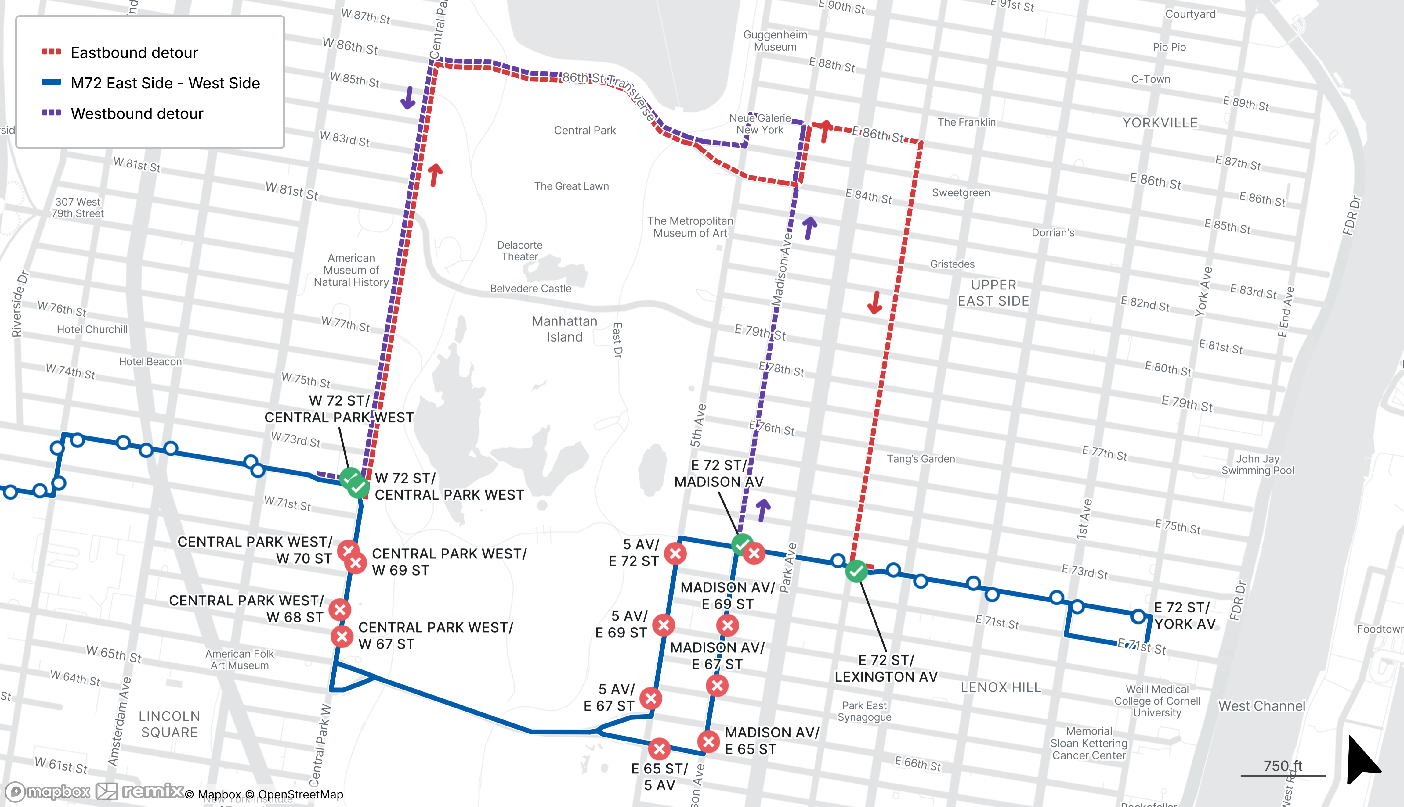 M72 buses will be detoured between W 72nd St at Central Park West and E 72nd St at Madison Ave