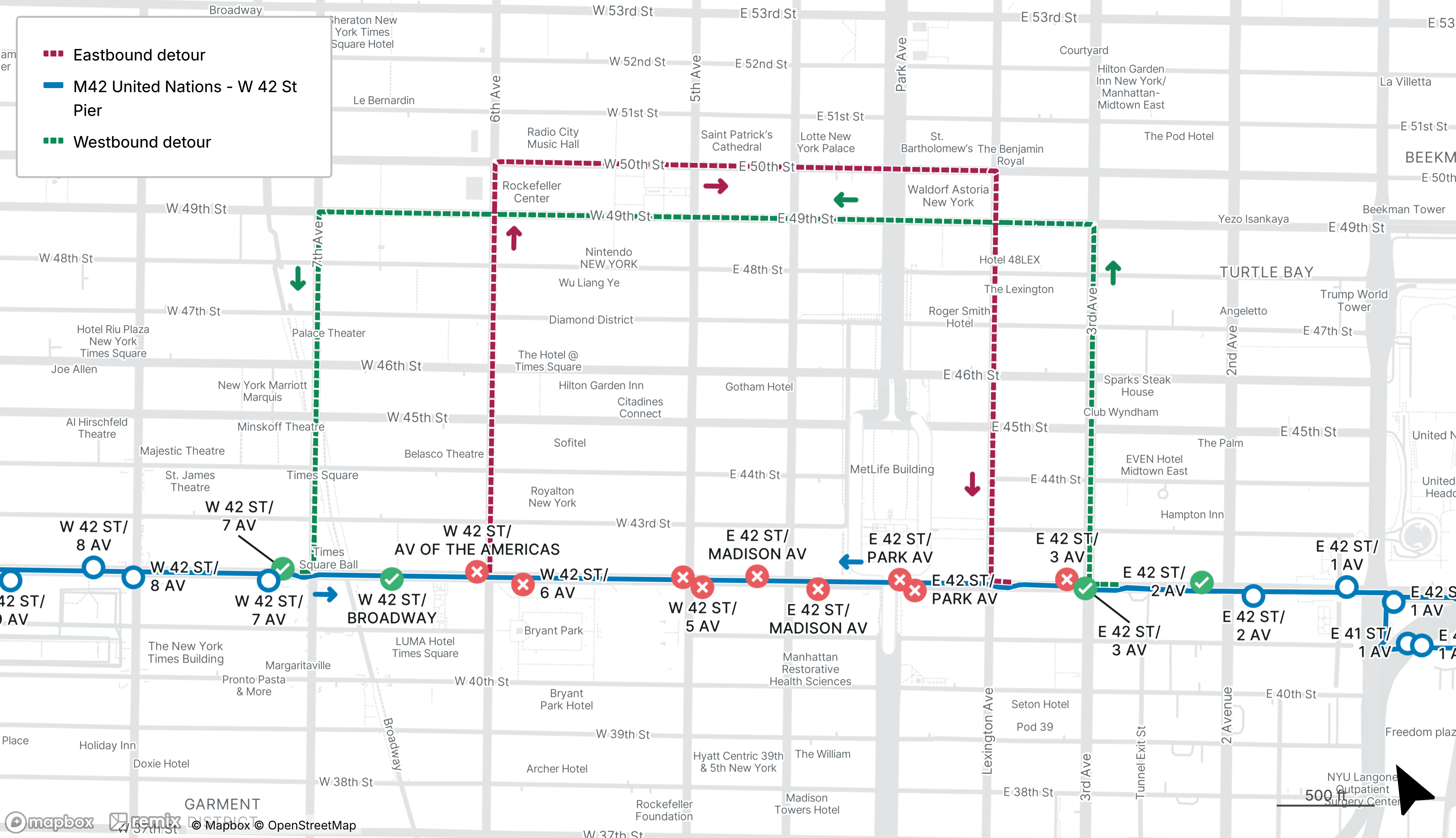 M42 buses will be detoured from 42nd St between 6th Ave and 3rd Ave