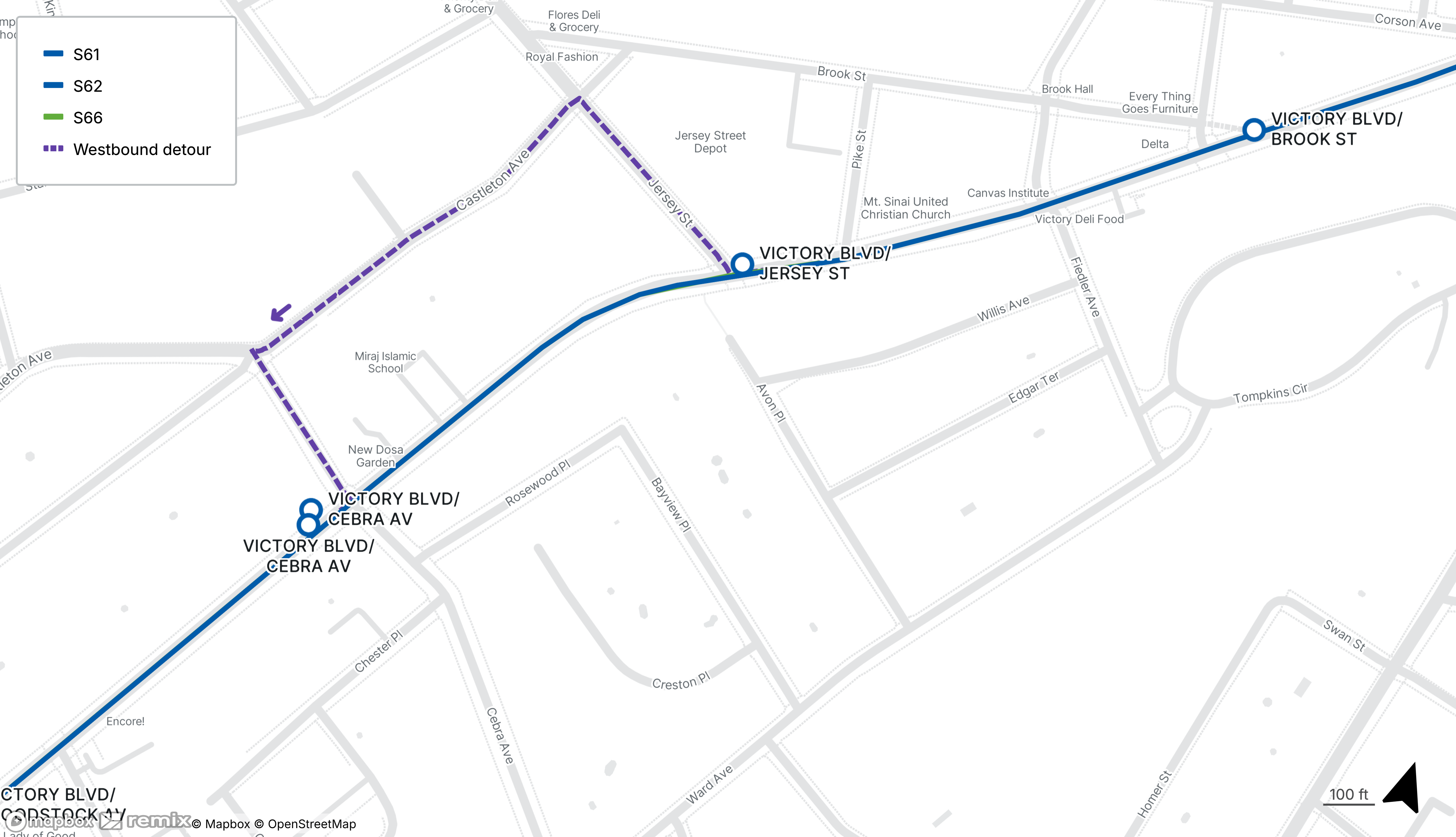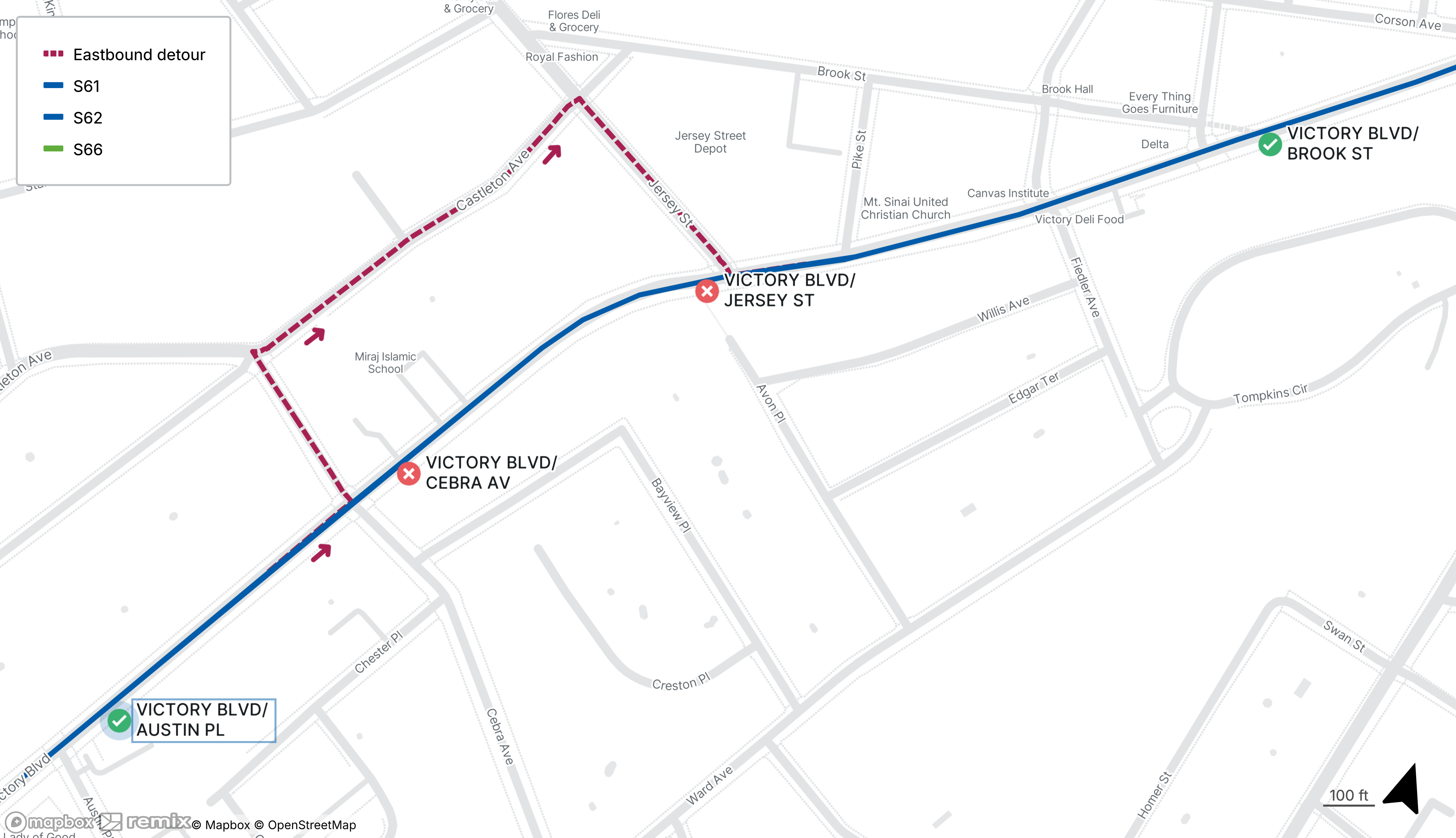 St George Ferry-bound S61, S62, S66 stops on Victory Blvd at Cebra Ave and Jersey St will be closed - no stops will be missed westbound