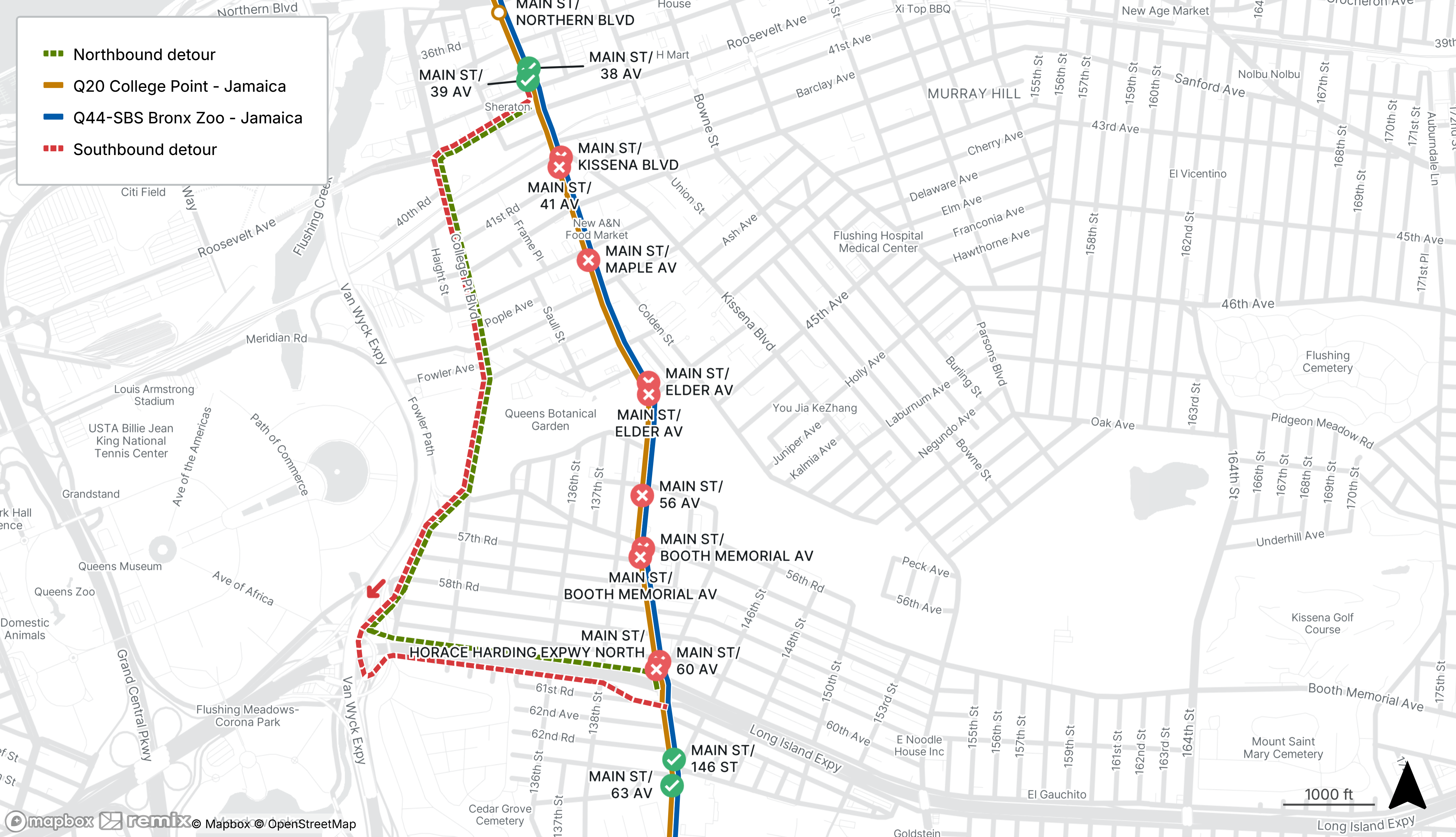 Q20 and Q44-SBS buses will be detoured from Main St between Horace Harding Expressway and Roosevelt Ave