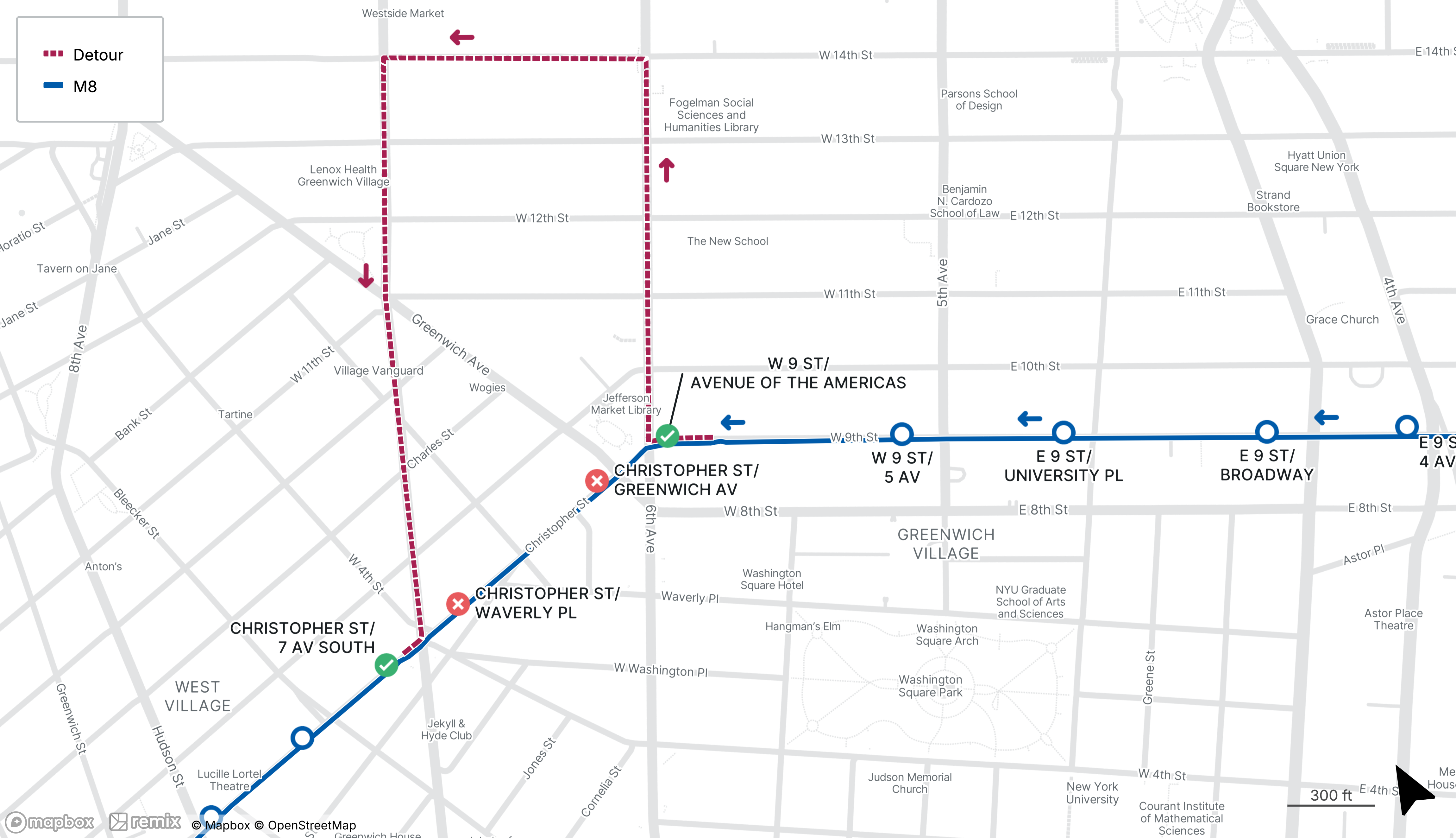 Westbound M8 stops on Christopher St at Greenwich Ave and Waverly Pl will be closed