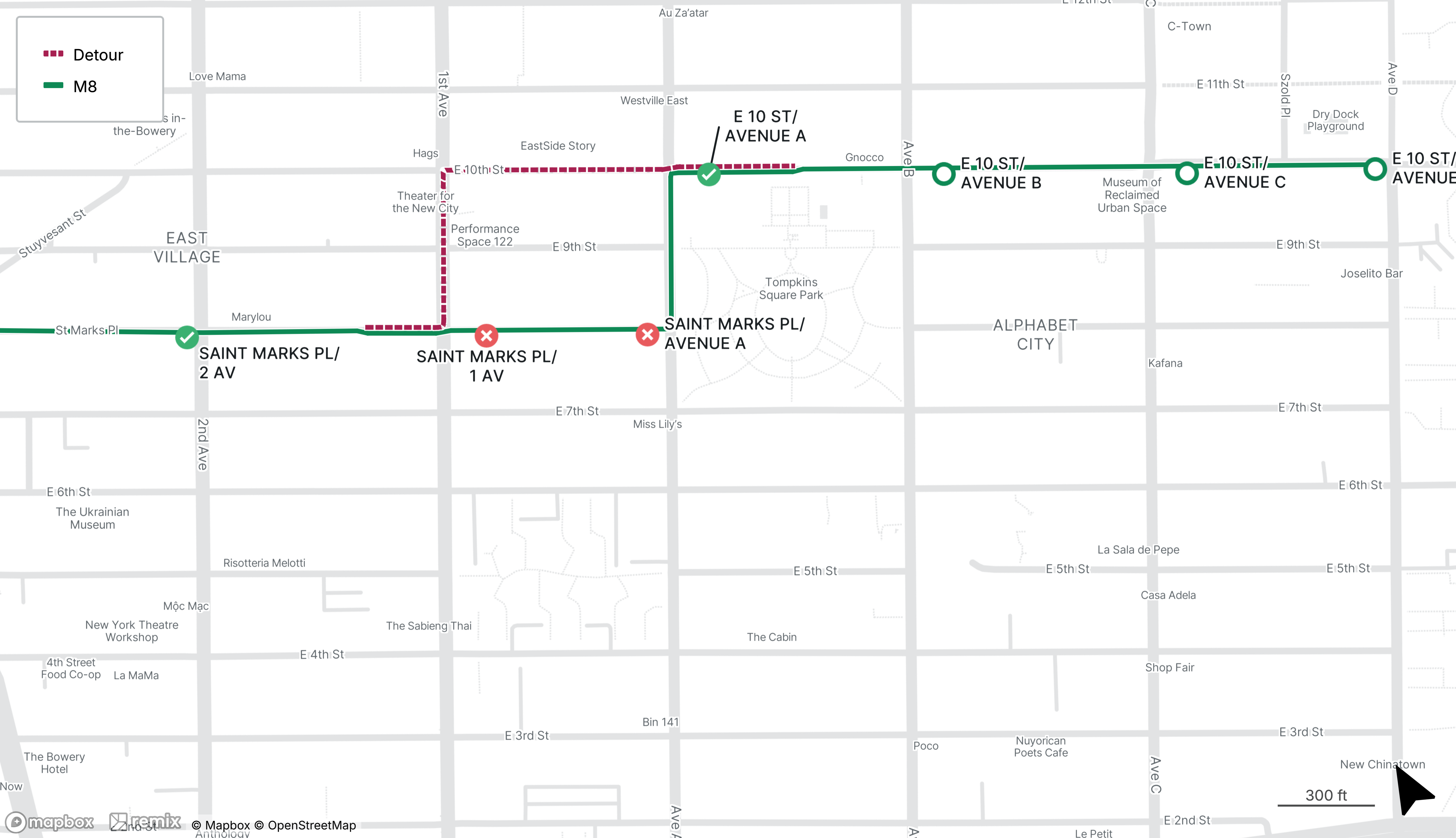 Eastbound M8 stops on Saint Marks Pl at 1st Ave and Avenue A will be closed