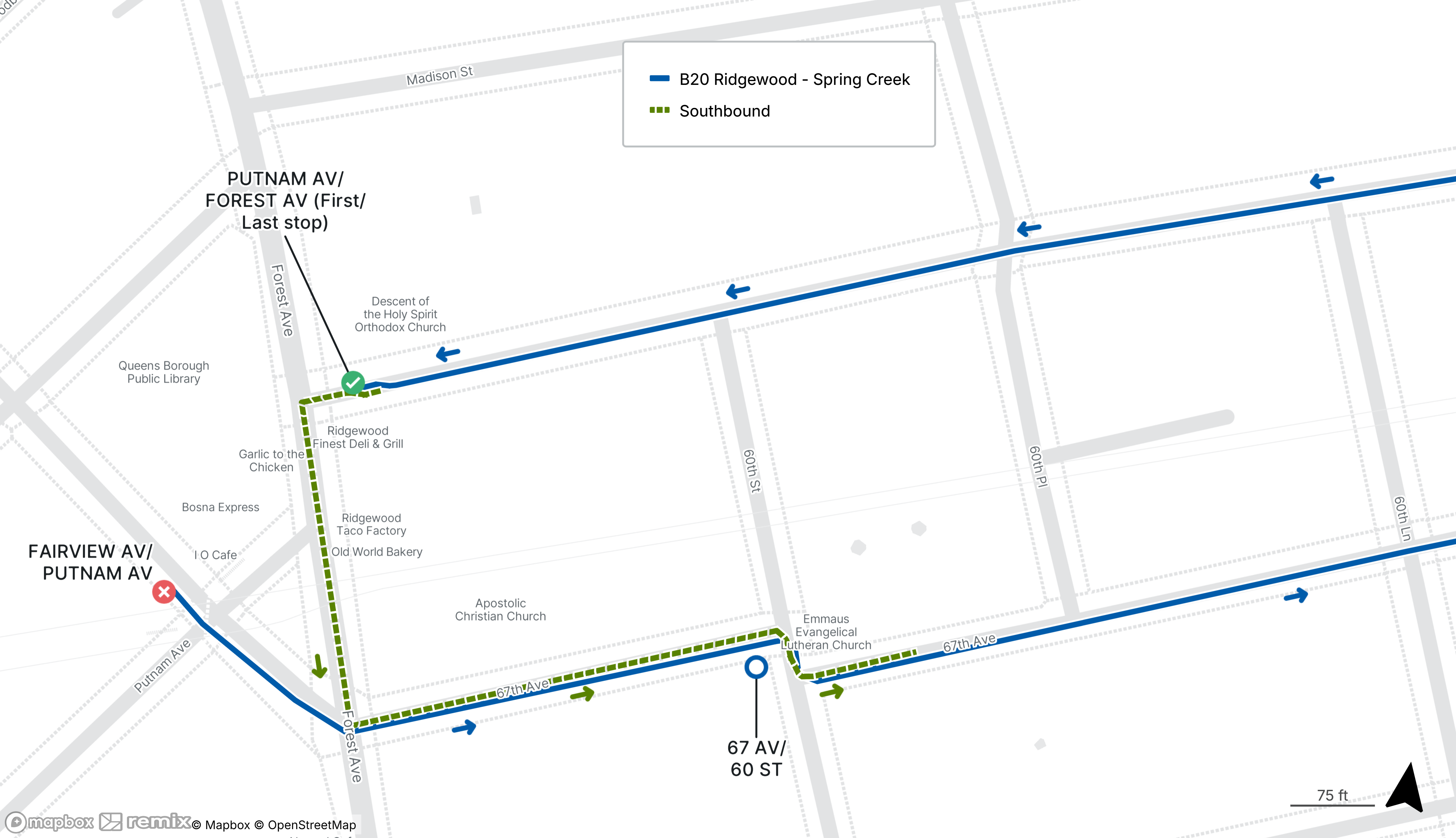 Southbound B20 stop on Fairview Ave at Putnam Ave is discontinued; northbound buses are now stopping at the existing southbound stop on Putnam Ave at Forest Ave