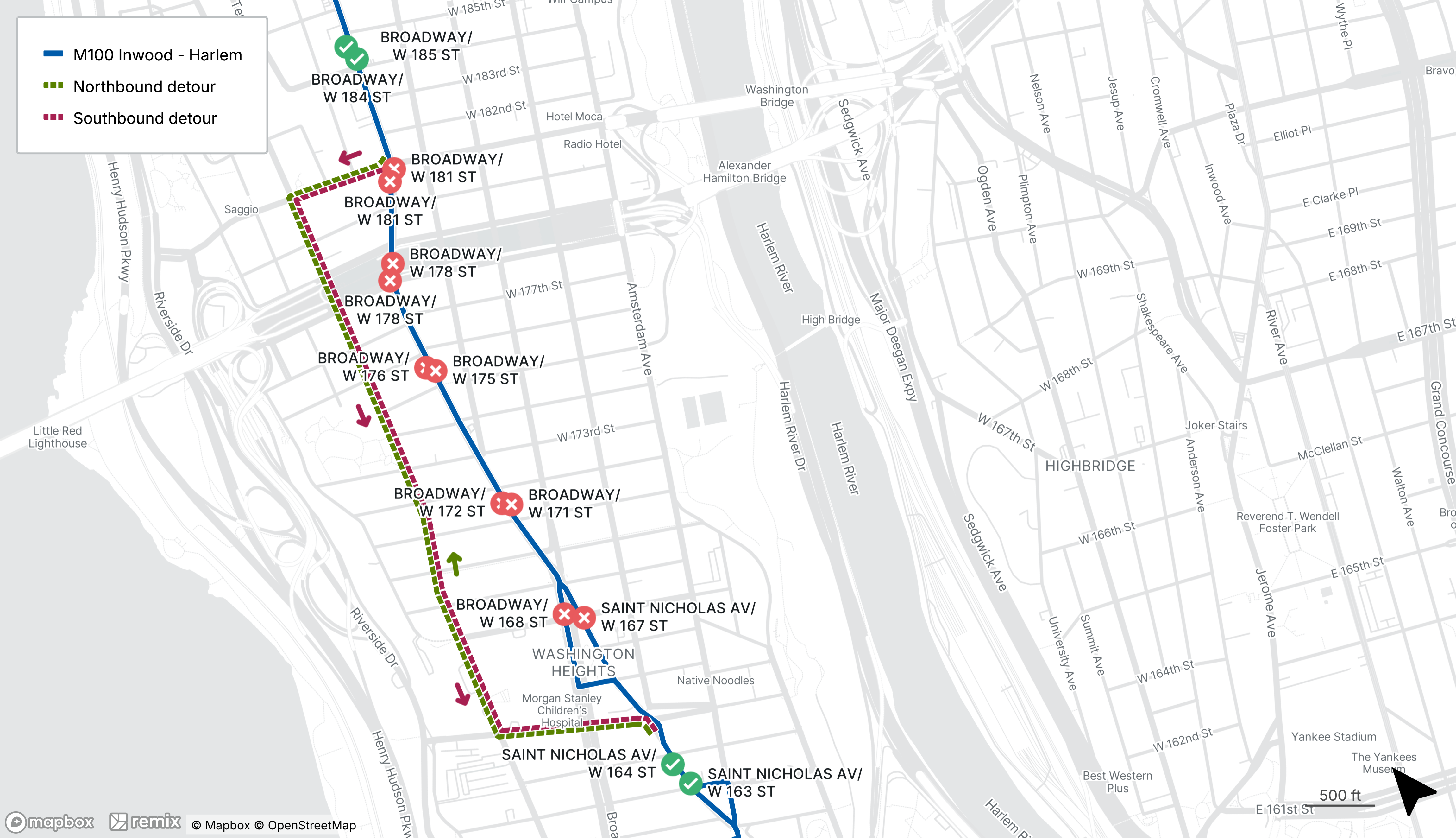 M100 buses will be detoured from Broadway between W 181st St and W 165th St
