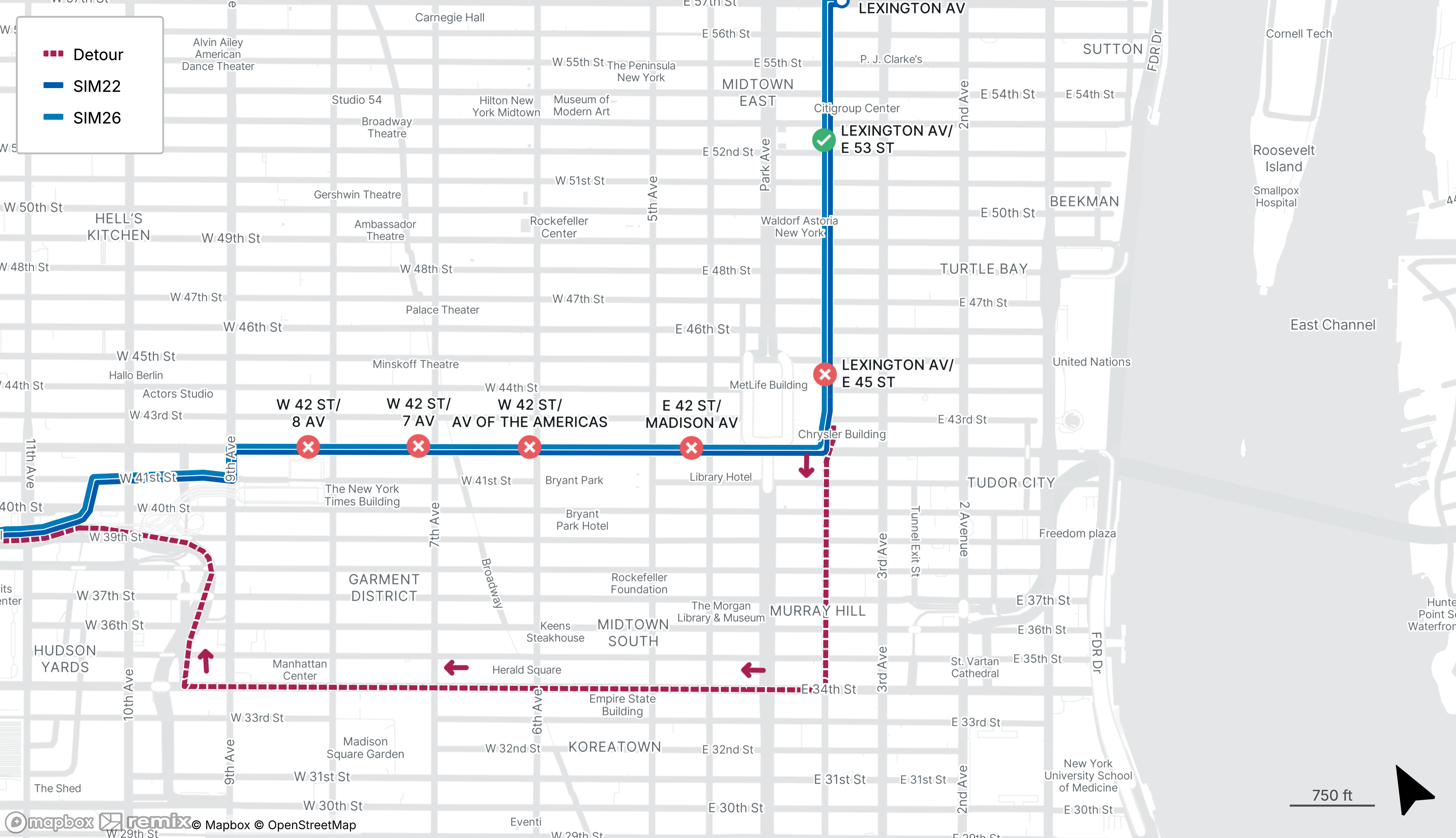 Southbound SIM22 and SIM26 are skipping the stop on Lexington Ave at E 45th St - use stops on Lexington Ave at E 53rd St or E 42nd St at Madison Ave instead