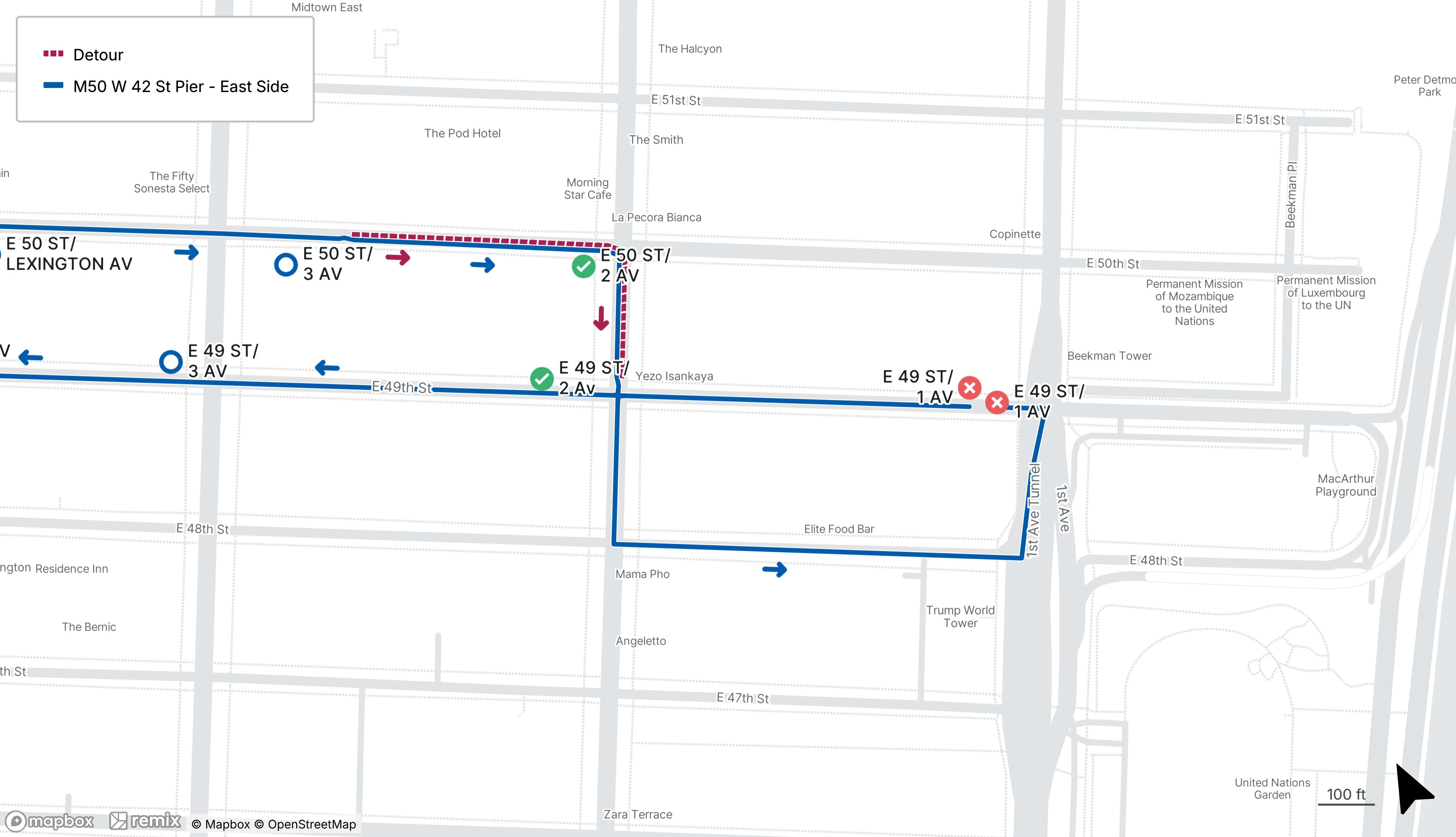 Starts Sun Apr 19 Until Sun Apr 19The last eastbound stop before the detour will be made on E 50th St at 2nd Ave.