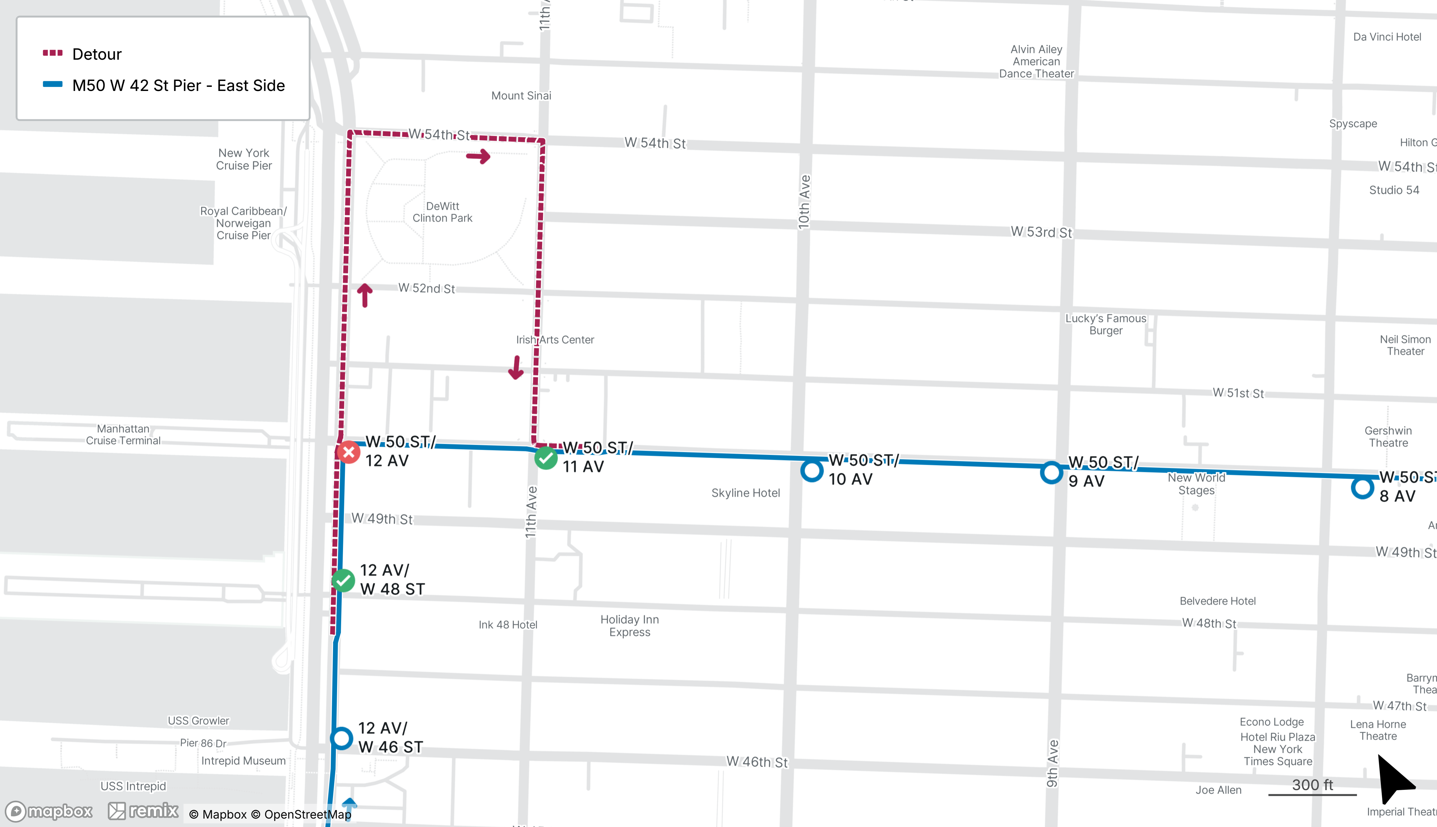 Eastbound M50 stop on W 50th St at 12th Ave will be closed, use the stops on 12th Ave at W 48th St or W 50th St at 11th Ave