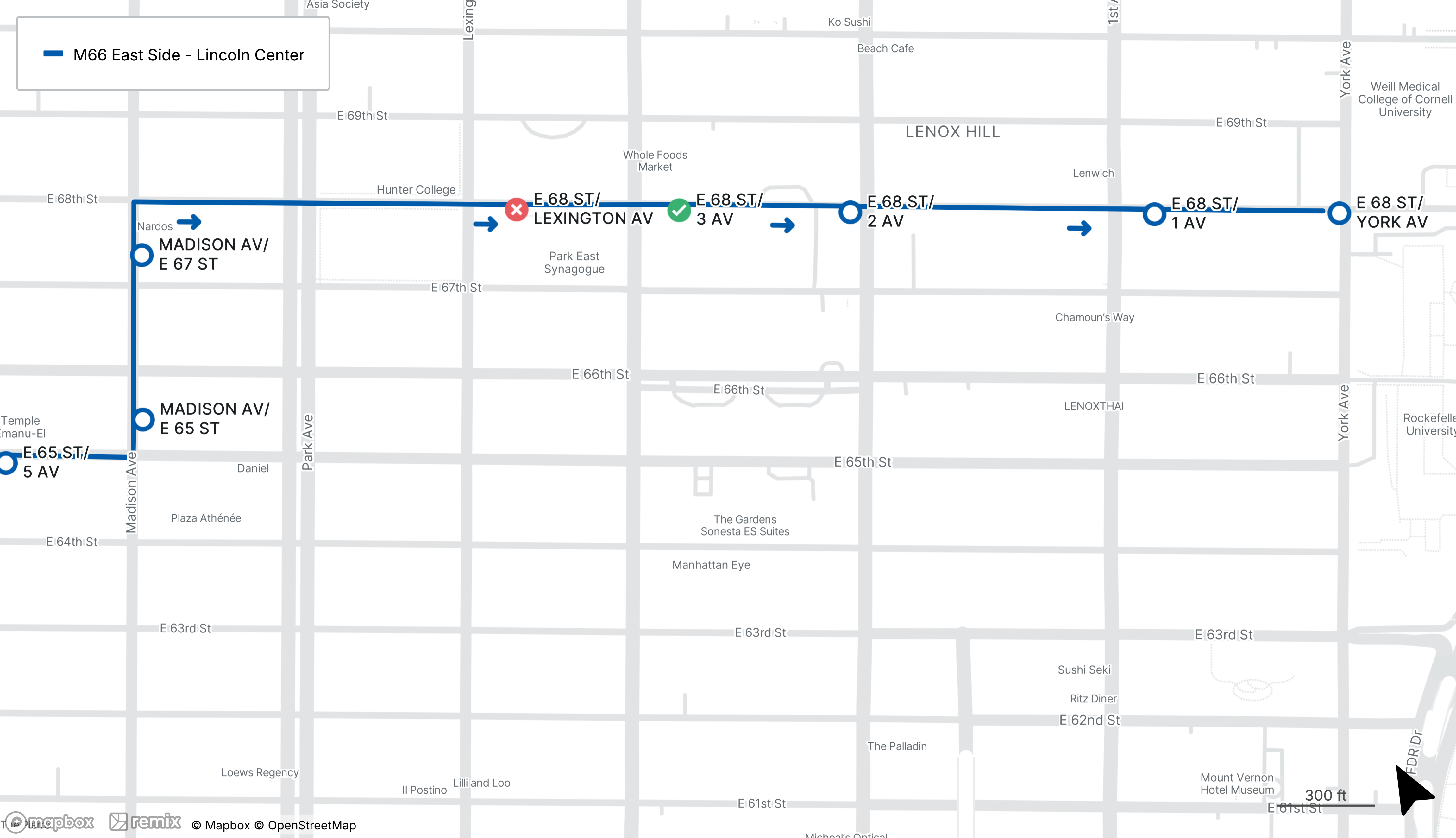 Westbound M66 stop on E 68th St at York Ave is closed, the first stop will be made on E 67th St at 1st Ave.