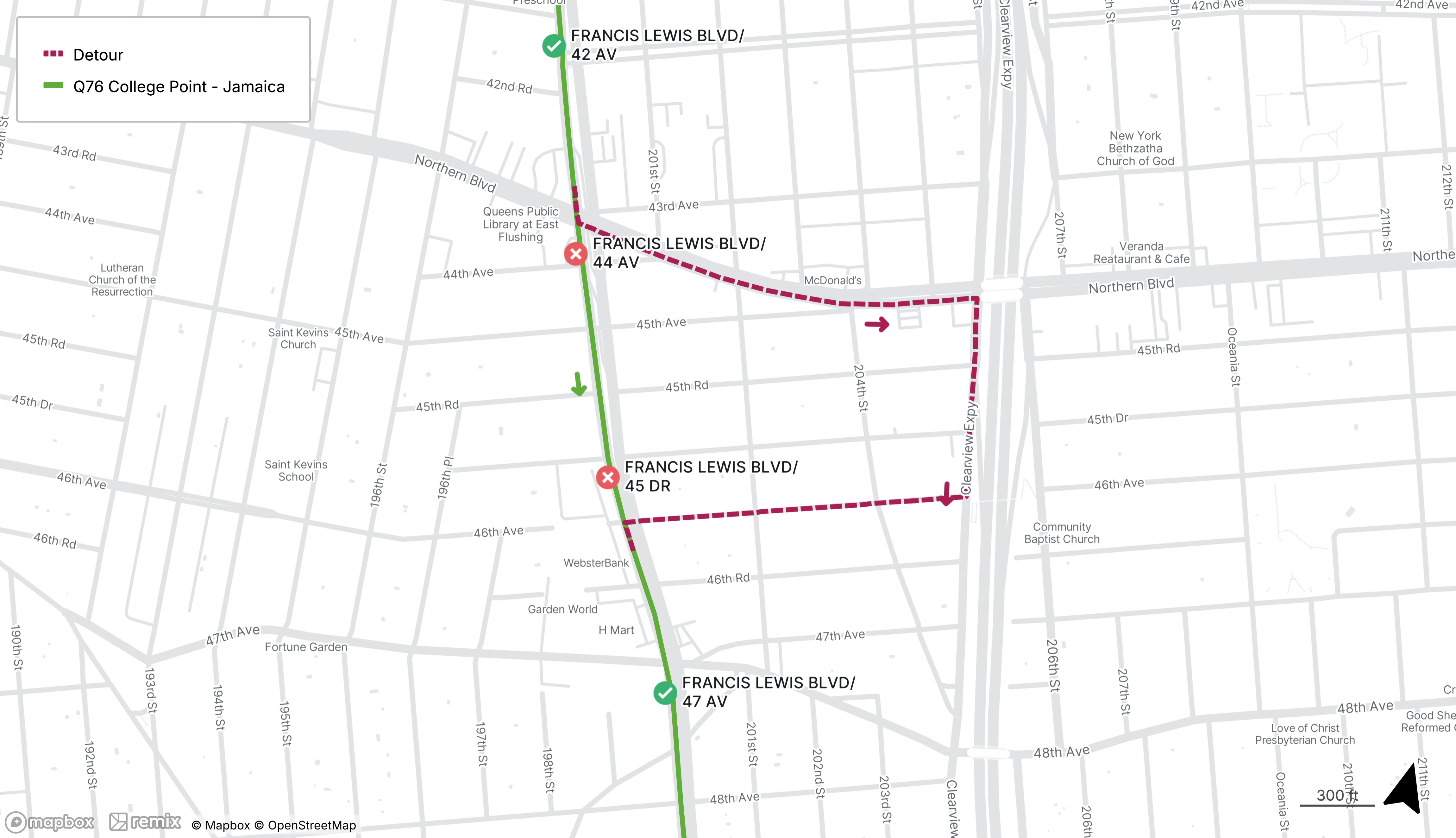 Southbound Q76 stops on Francis Lewis Blvd at 44th Ave and 45th Dr will be closed, use the stops on Francis Lewis Blvd at 42nd Ave or 47th Ave