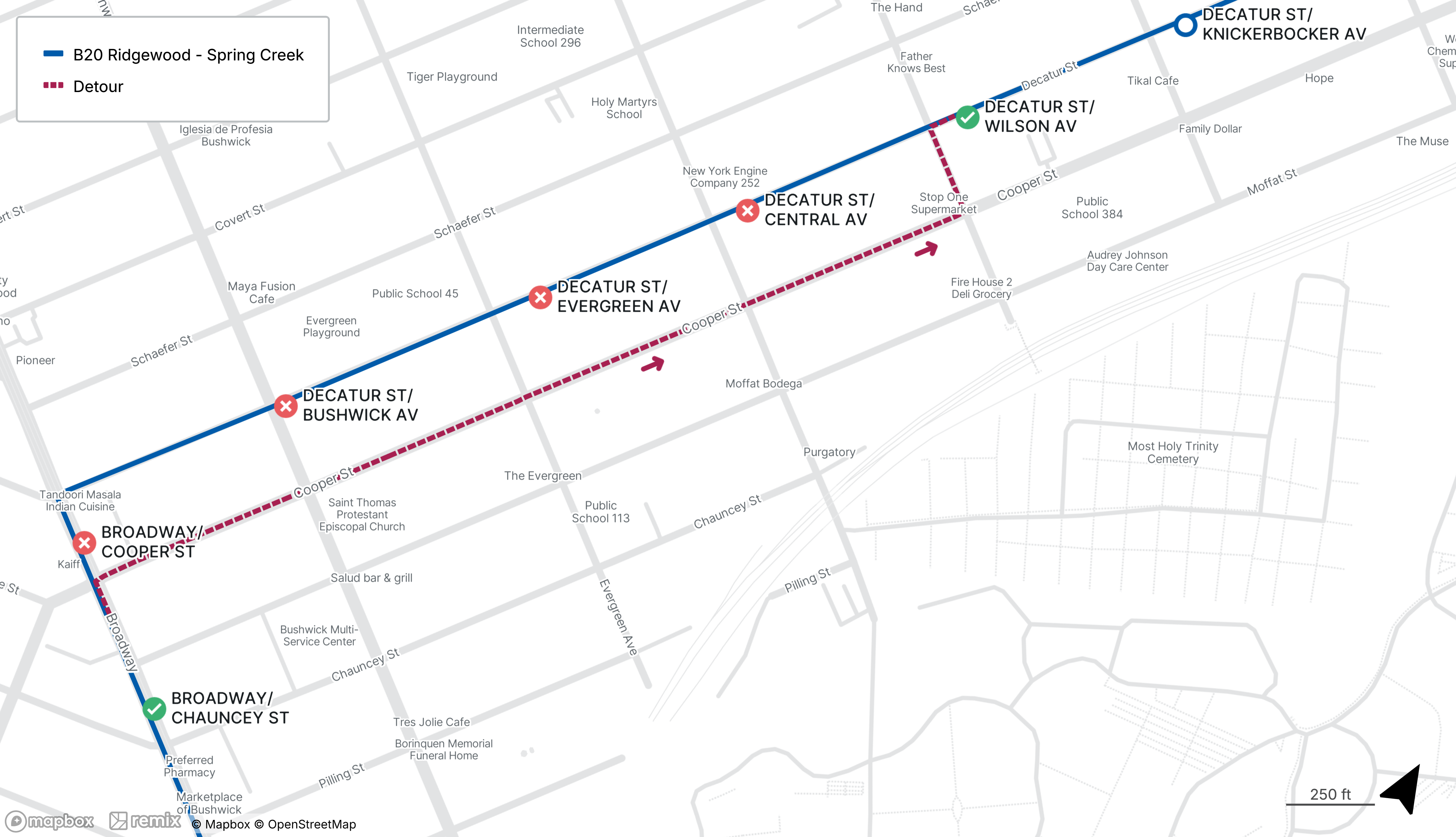 Northbound B20 stops on Broadway at Cooper St and on Decatur St from Bushwick Ave to Central Ave will be closed